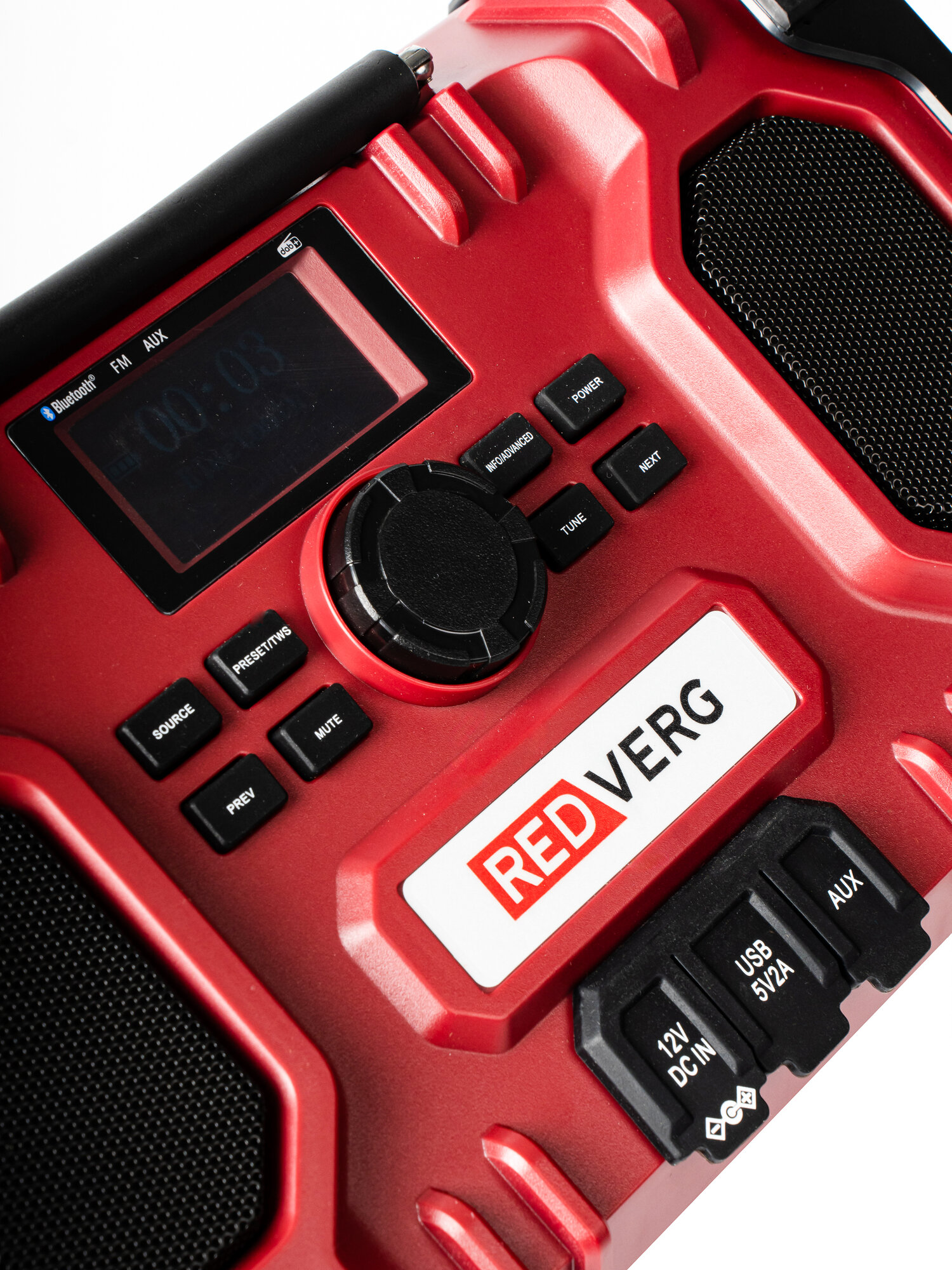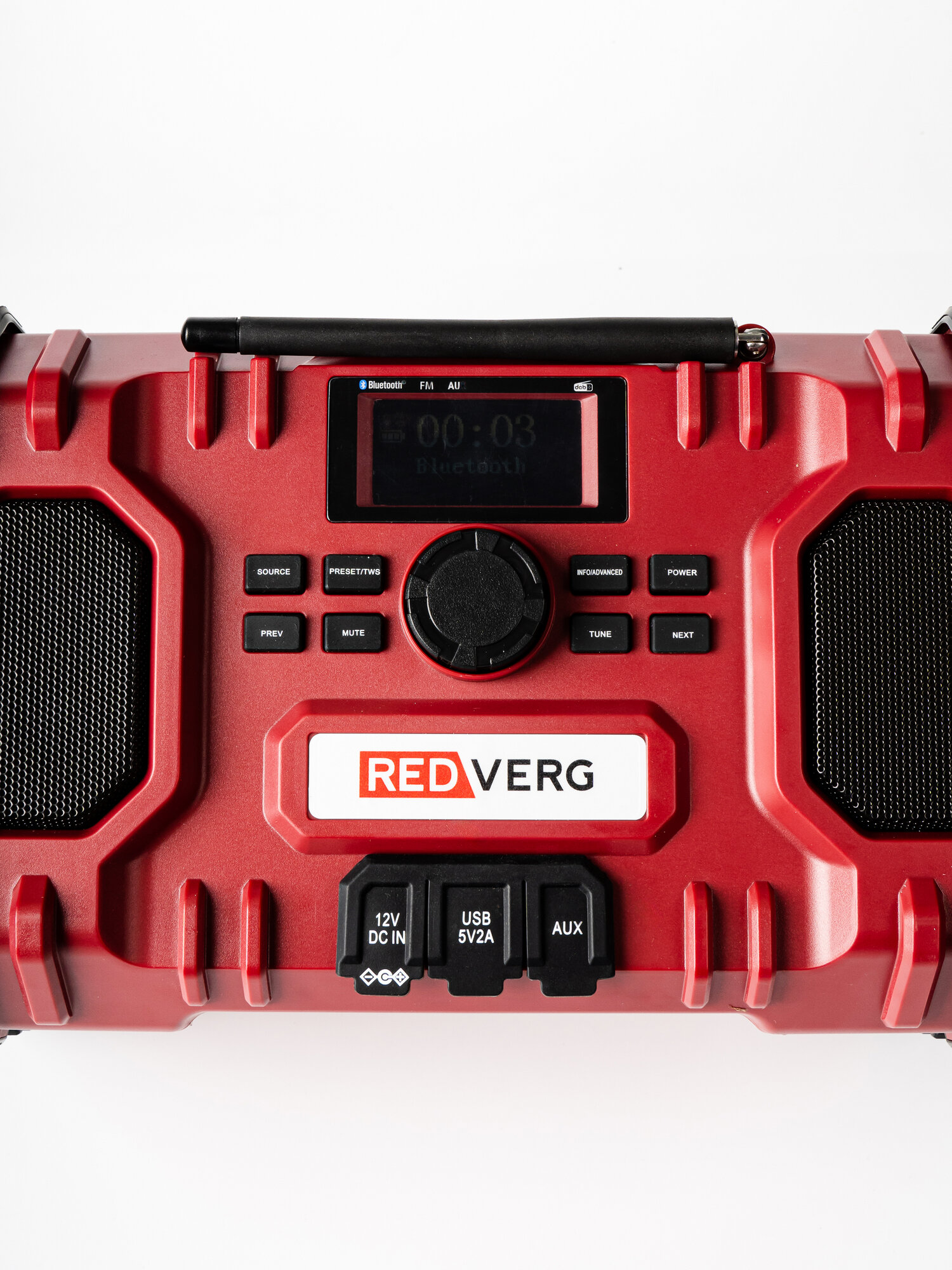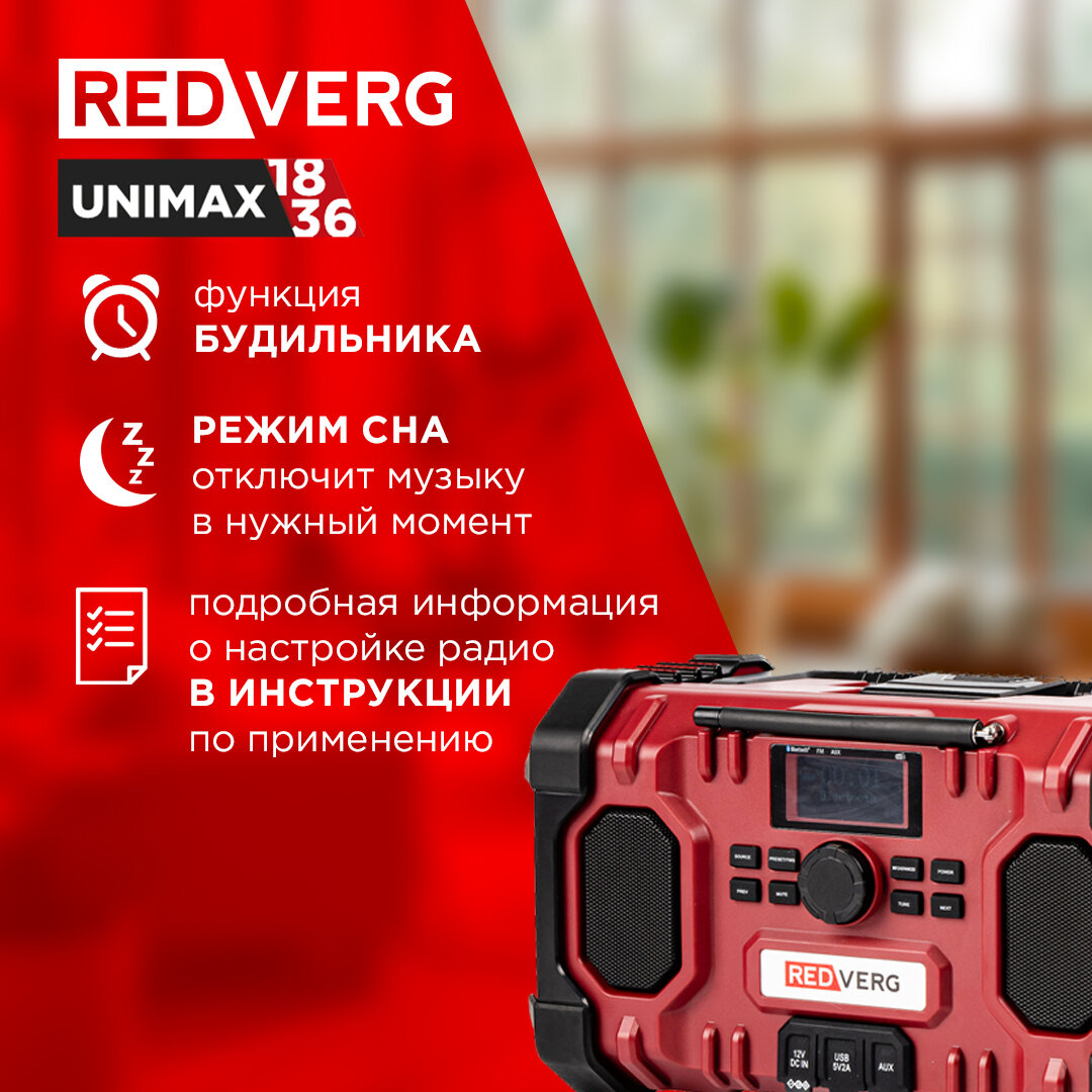 Радио аккумуляторное REDVERG RD-RR18/U (без акк, без з/у) с возможностью подключения к электросети, или к питанию от литиево-ионной аккумуляторной батареи 18В. Динамики для воспроизведения музыки, транслируемой FM/AM-радиостанциями, и MP3-файлов.