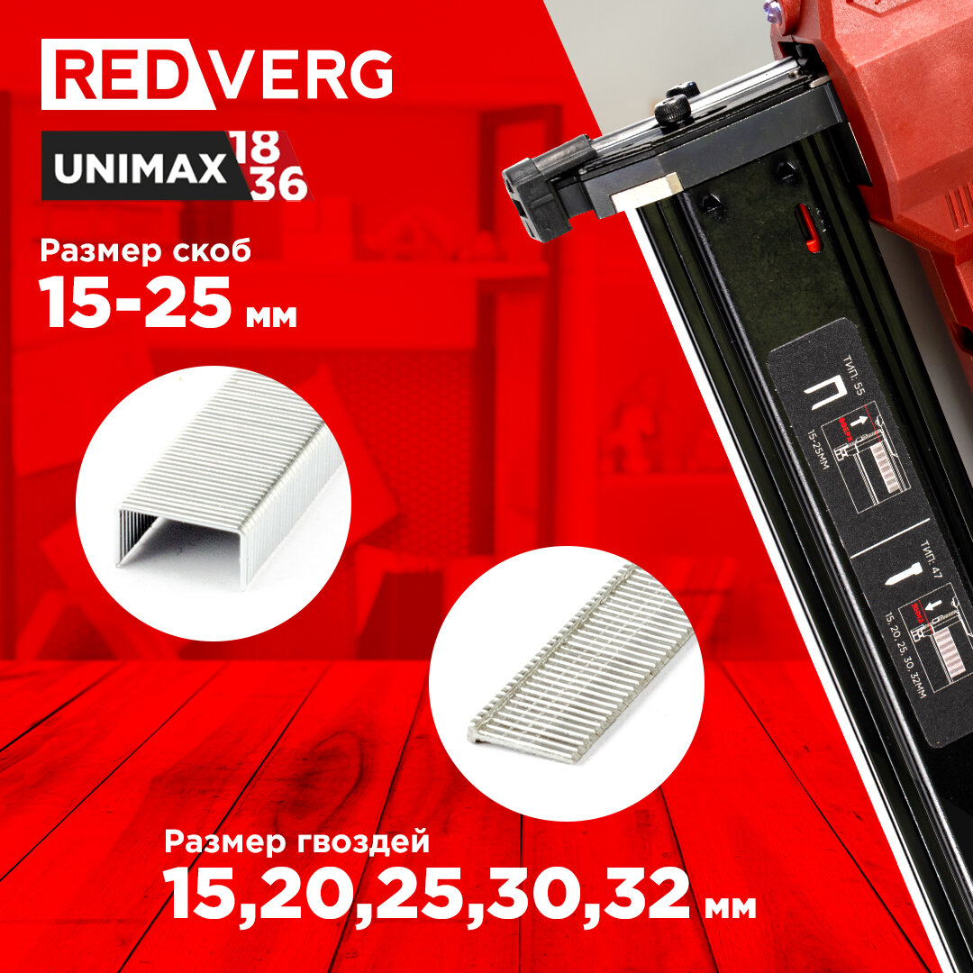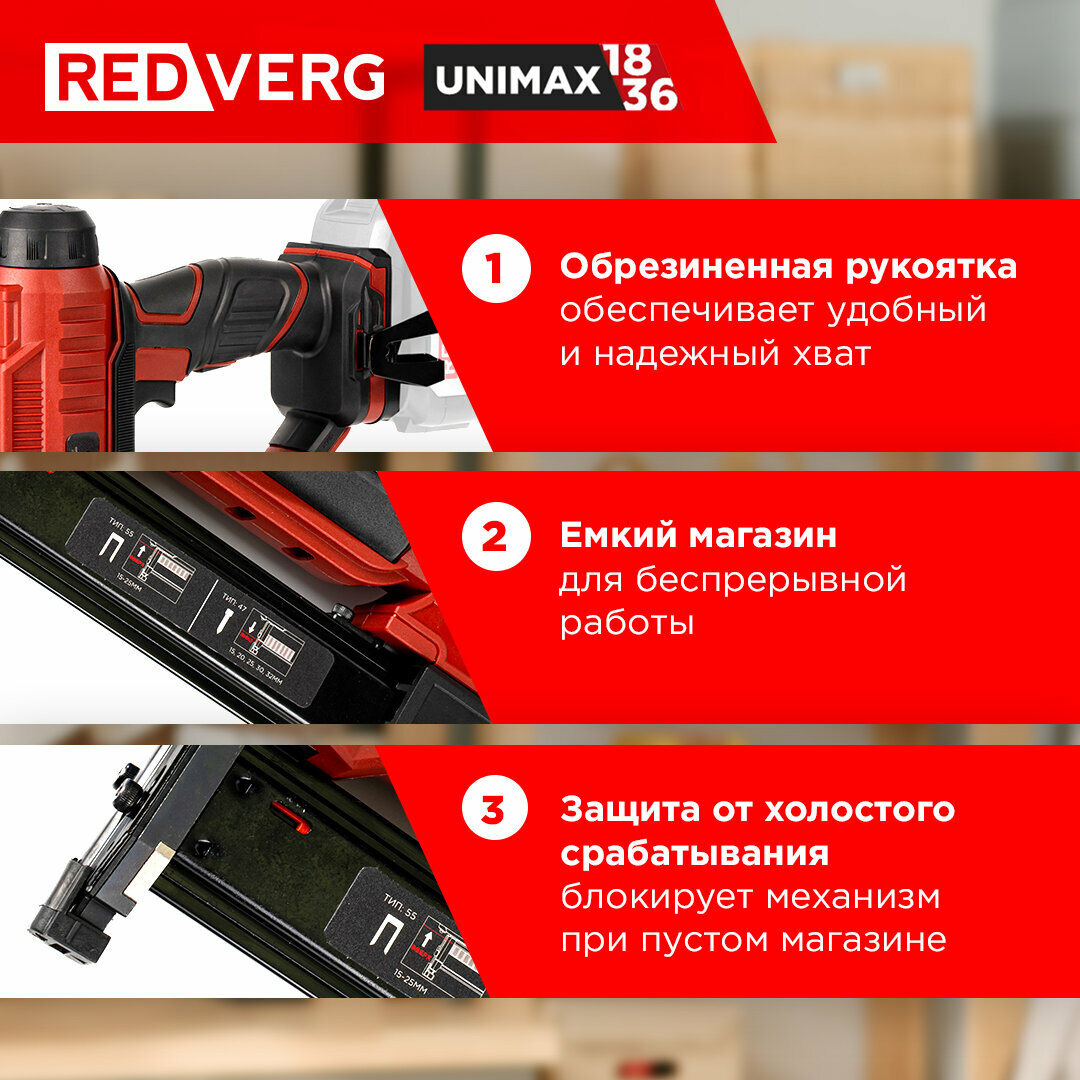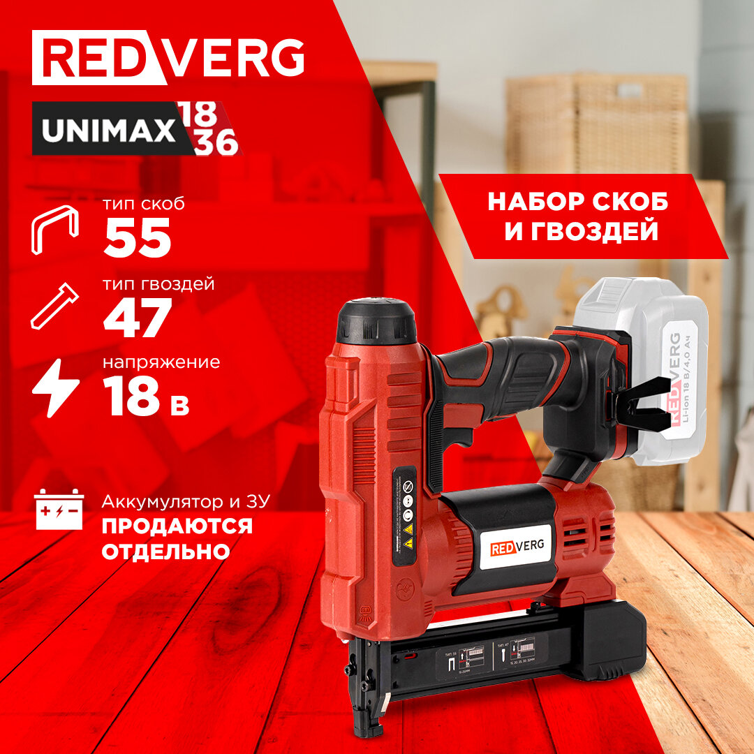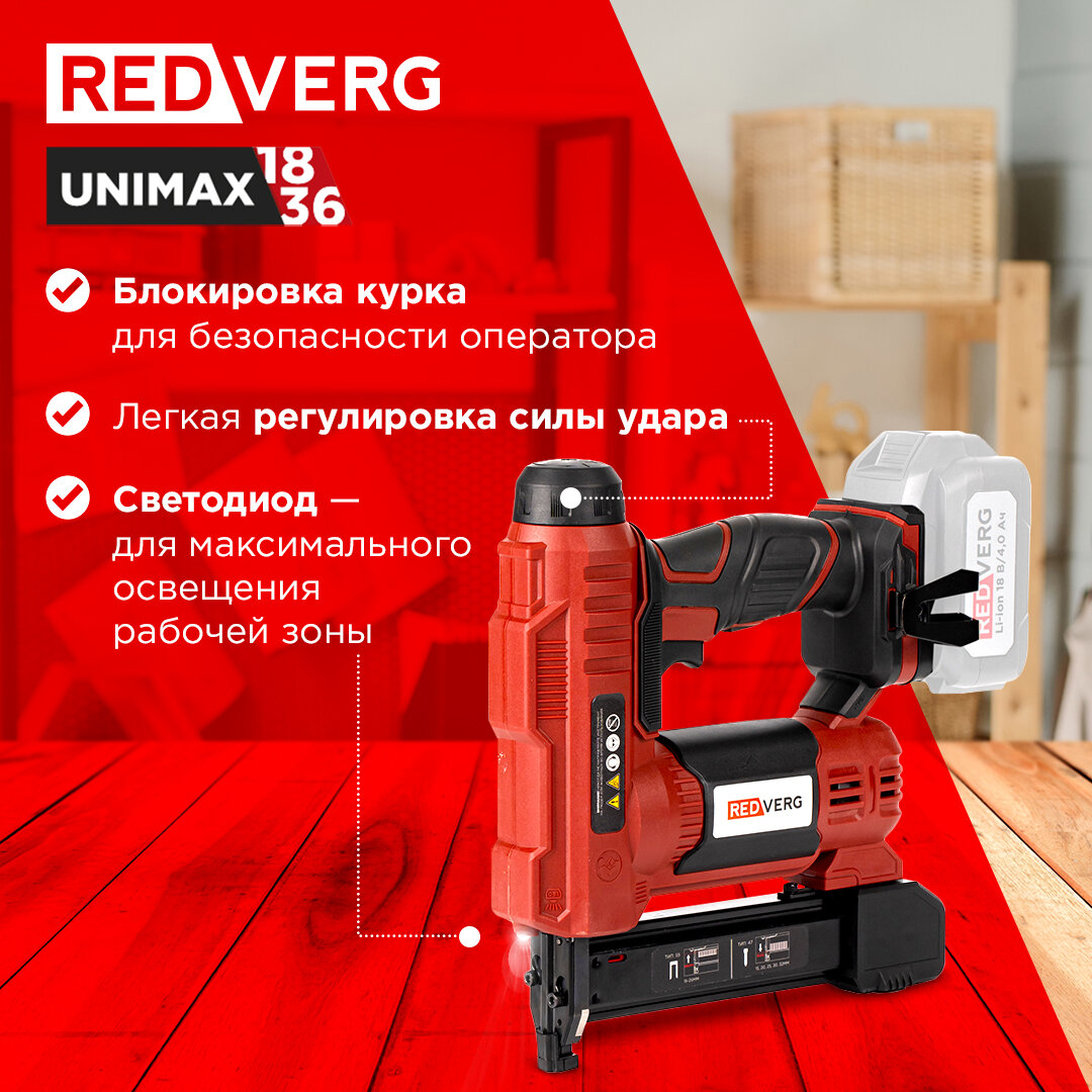 - Единая аккумуляторная система REDVERG Unimax 18/36 - позволяет использовать один аккумулятор с различным электроинструментом одной серии