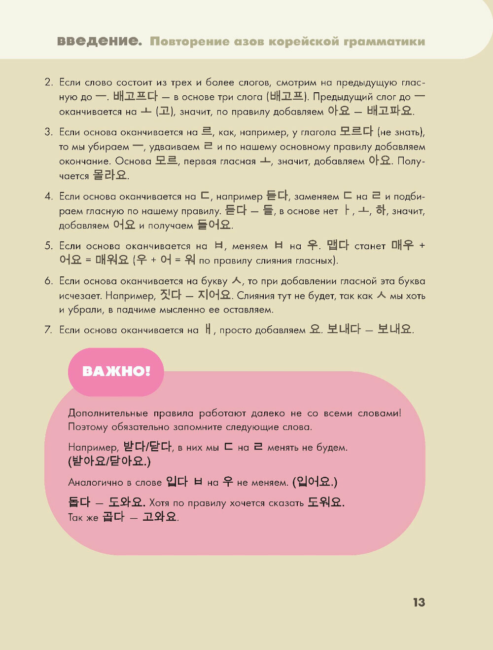 Самоучитель предназначен для тех, кто уже знаком с основами корейского языка. В книге рассматриваются важные грамматические конструкции, сленг и сокращения в переписках, частые ошибки и обманчиво схожие слова. Полученные знания закрепляются на письменной практике.