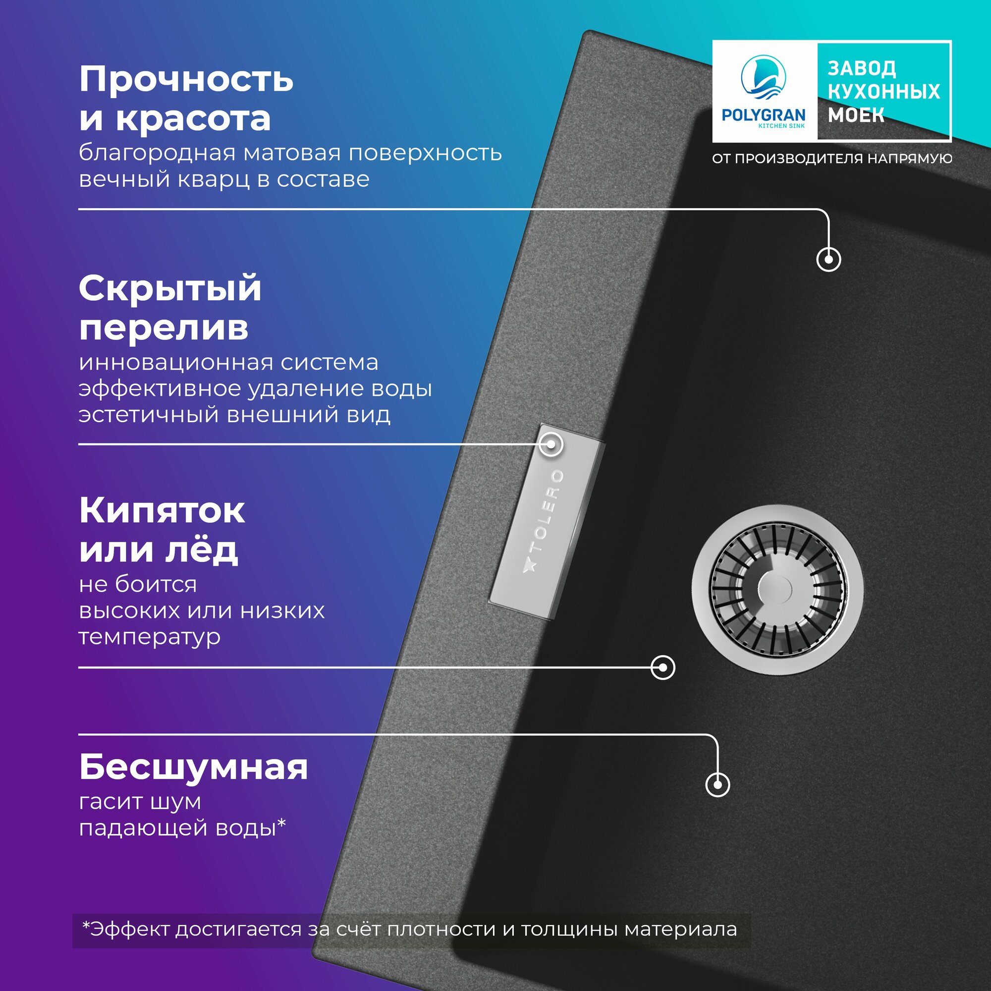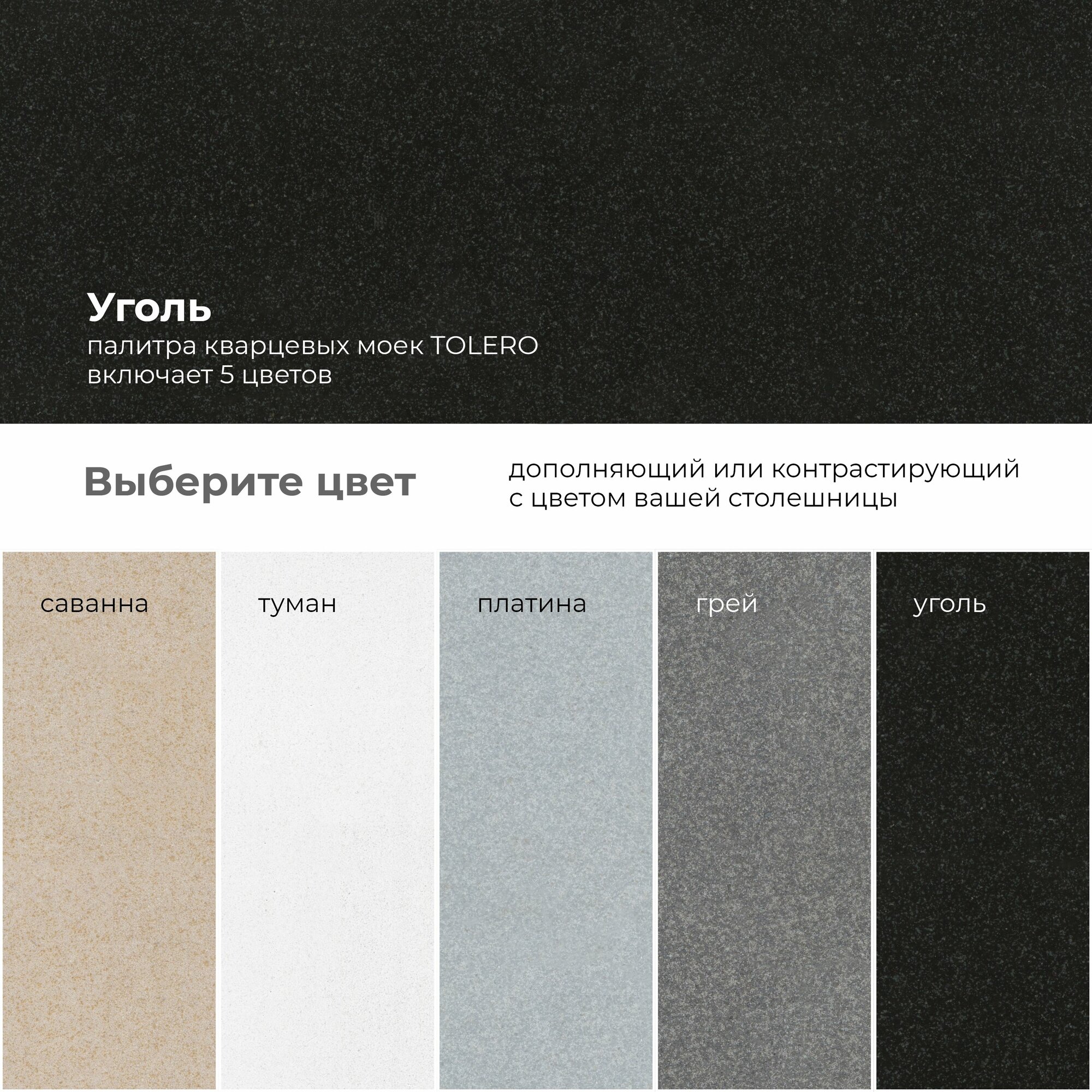 Композитная мойка для кухни TOLERO twist –мойка премиум класса! Современное дизайнерское решение - линейка комбинированных кухонных моек с рабочей поверхностью из композитного материала на основе кварцевого песка и чаши выполненной из нержавеющей стали марки AISI 304 (толщина 1 мм). Такие кухонные мойки на долгие годы сохраняют аккуратный внешний вид. Отверстие под смеситель заранее засверлено с обратной стороны крыла на 2/3 столешницы крыла и легко выбивается. Для лучшей шумоизоляции чаша раковины с обратной стороны полностью покрыта композитным полиуретановым слоем. Глубина чаши, 200 мм, позволяет с комфортом мыть посуду и минимизирует появление нежелательных брызг. Квадратная кухонная мойка идеально впишется на вашей кухне и будет радовать Вас стильным внешним видом, легкостью эксплуатации и своим качеством. Мы уверены в качестве своей продукции, наши мойки имеют повышенный срок гарантии – 5 лет. Покупатели отмечают высокую надежность, практичность и долговечность!важноВнешний вид может быть испорчен при активном использовании абразивных веществ и металлических скребков. Мойка из кварца не требует приложения больших усилий для ухода в процессе эксплуатации. На поверхности не появляется ржавчина или неприятные следы, поэтому при правильном использовании изделия, нужно будет просто мягкой салфеткой протирать поверхность изделия.