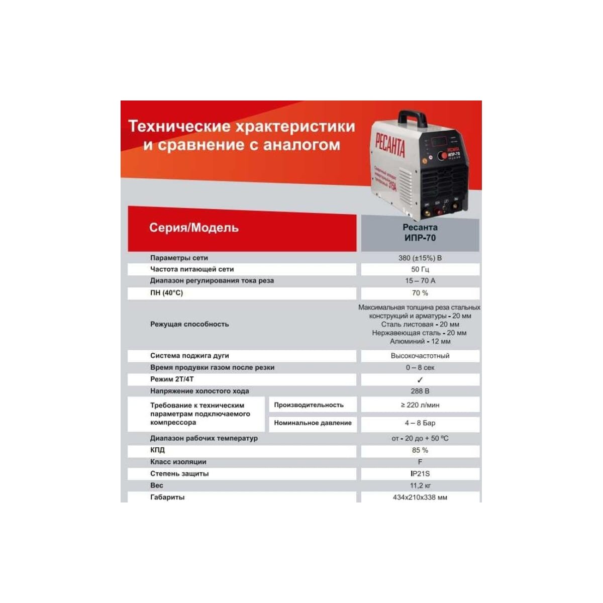 | Наименование модели | Инверторный плазменный резак Ресанта ИПР-70 |