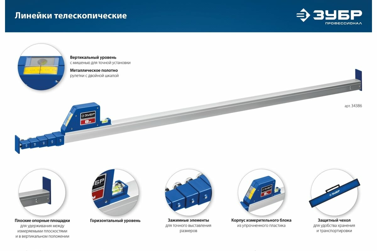 Телескопическая линейка ЗУБР 34386, предназначена для точных измерений линейных размеров между элементами конструкций при выполнении строительных работ. Профессиональный инструмент для сложных измерений крупных объектов.Телескопическая конструкция.