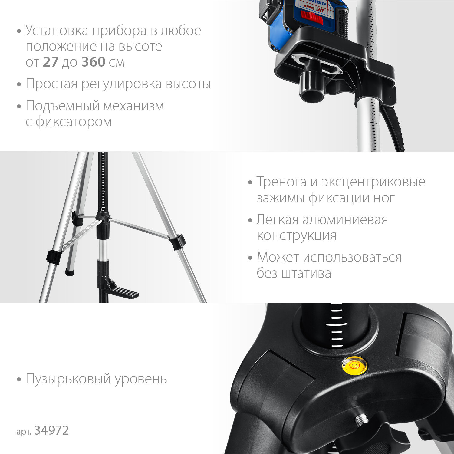 | Конструктивные особенности | пузырьковый уровень, телескопический |