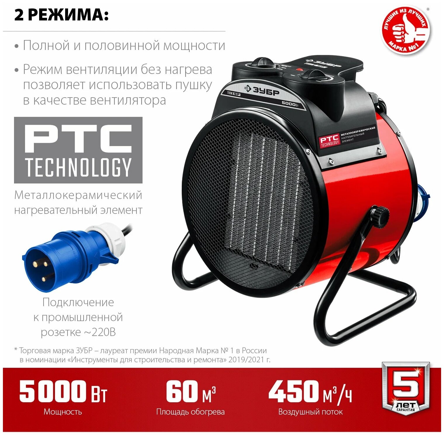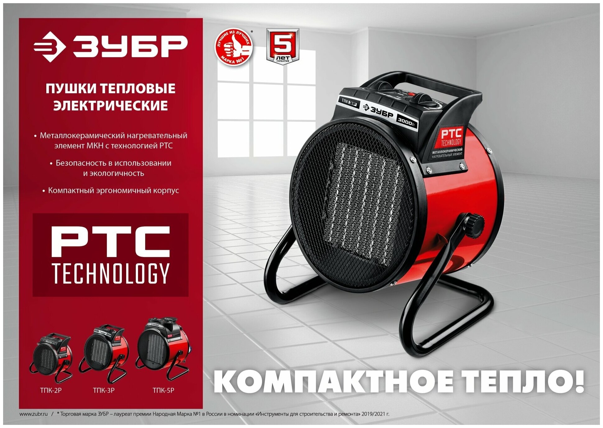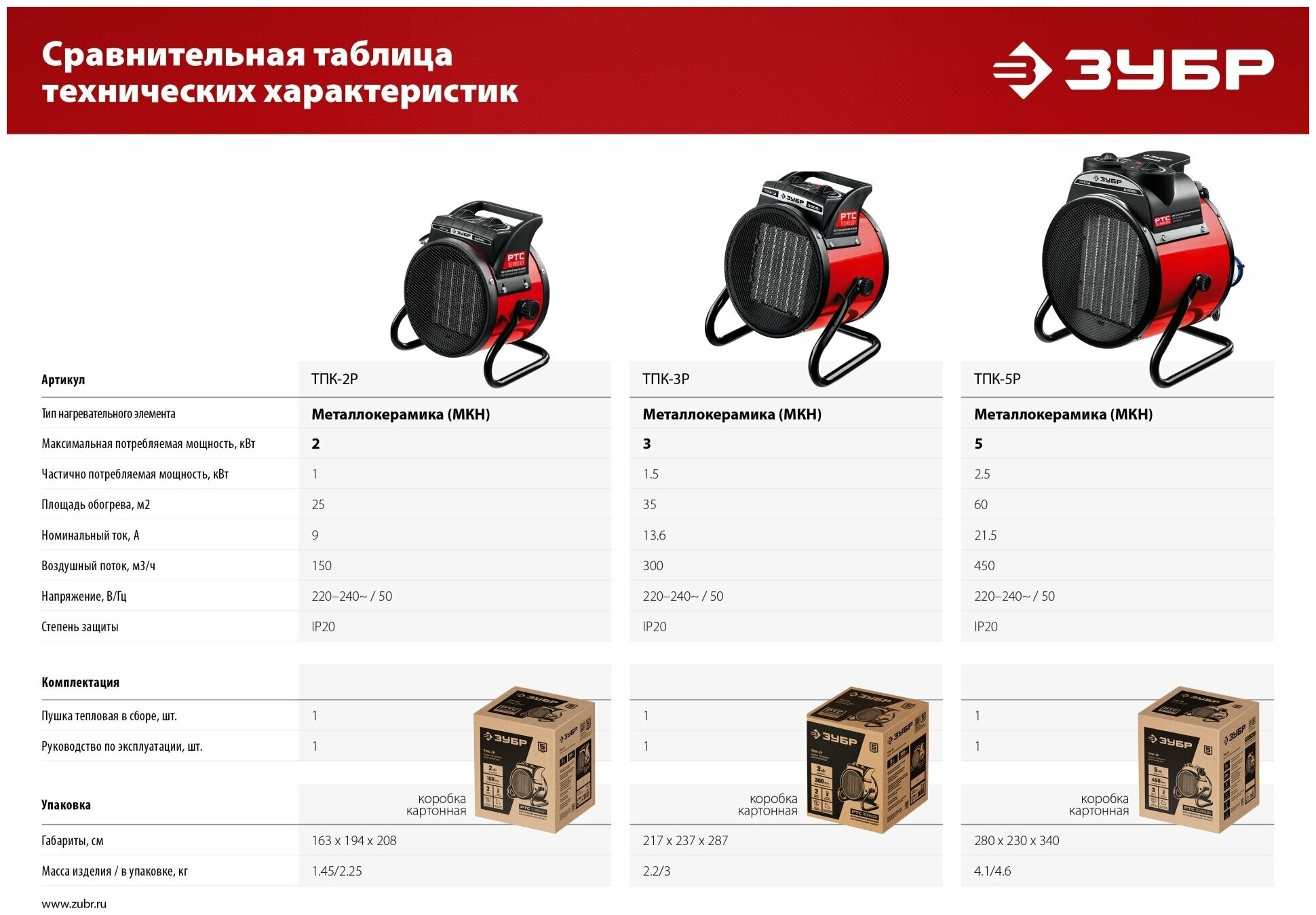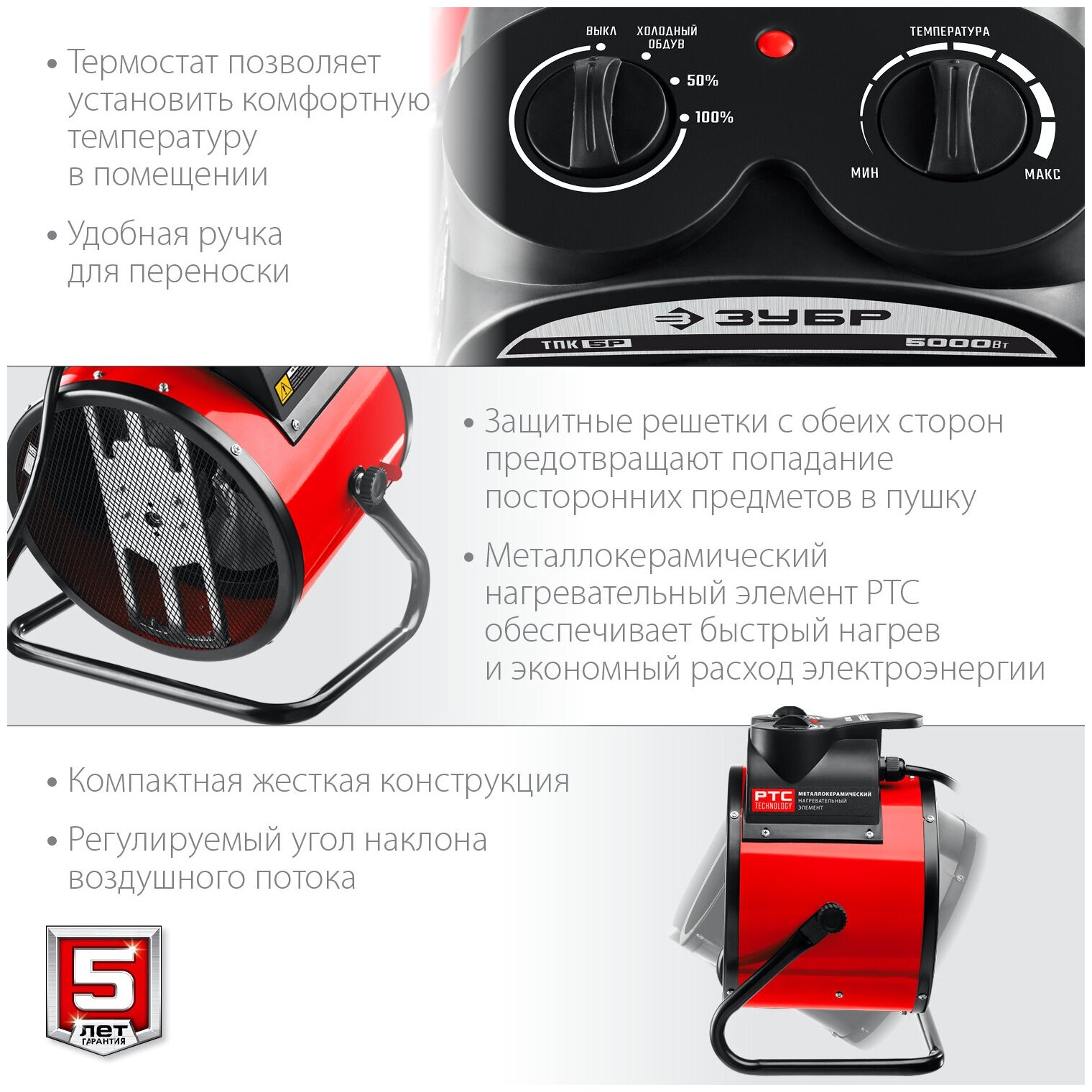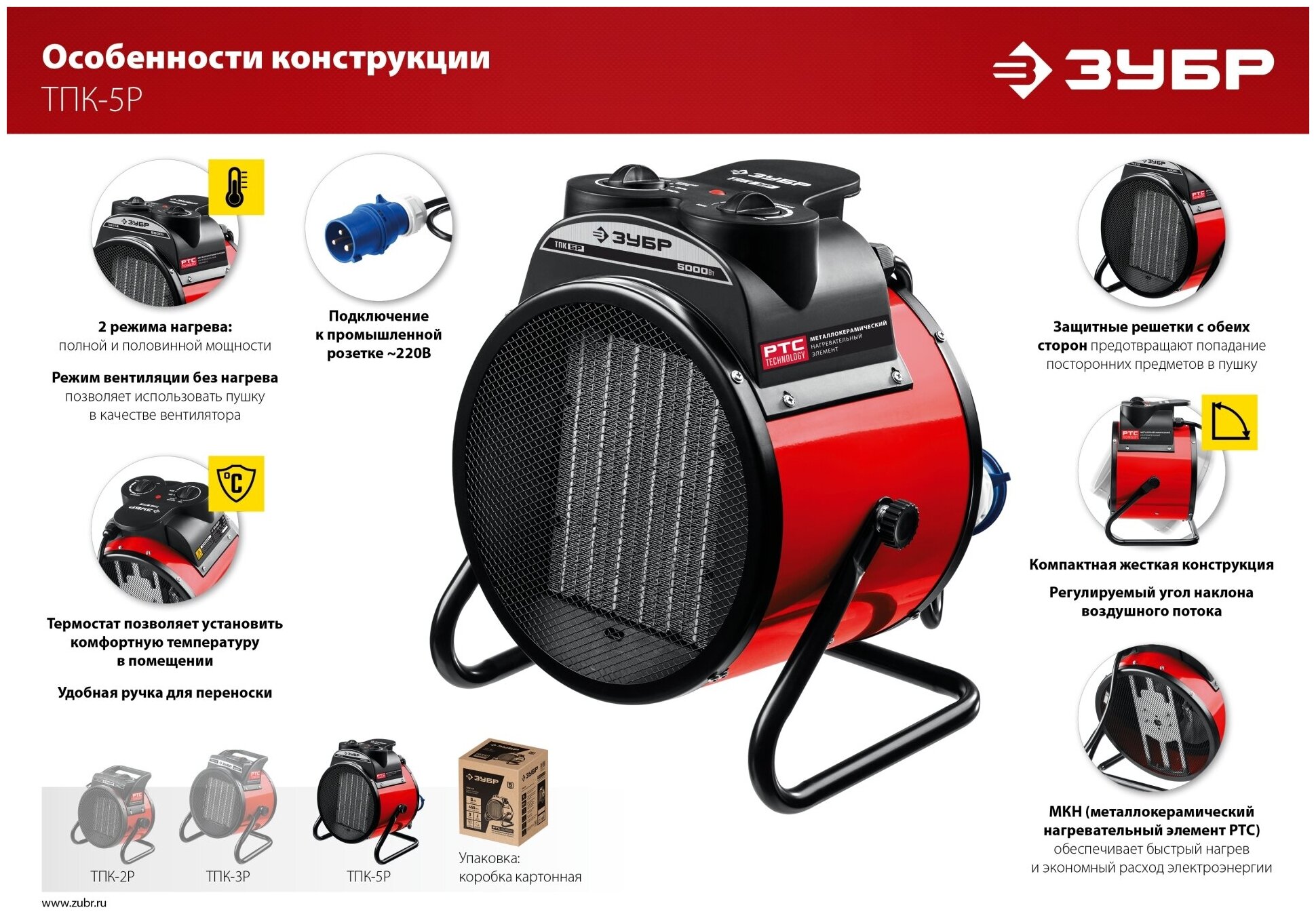 Электрическая тепловая пушка ЗУБР ТПК-3Р, предназначена для эффективного обогрева квартиры, офисы, магазины, бытовки, вагончики, гаражи и т.д. Электрические тепловые пушки ЗУБР серии ТПК –Р - компактные пушки в круглом корпусе для обогрева небольших помещений. Благодаря небольшим размерам тепловую пушку легко переносить и хранить. Устройства оснащены долговечным металлокерамическим нагревательным элементом, обеспечивающим быстрый равномерный нагрев, экономное потребление электроэнергии и при этом не сушит воздух в помещении. Механический терморегулятор поддерживает нужную температуру нагрева. За счет большой площади теплообмена и небольшой температуры нагрева элемента, воздух быстро прогревается. Небольшой размер и вес позволяет легко переносить тепловую пушку из одного помещения в другое.