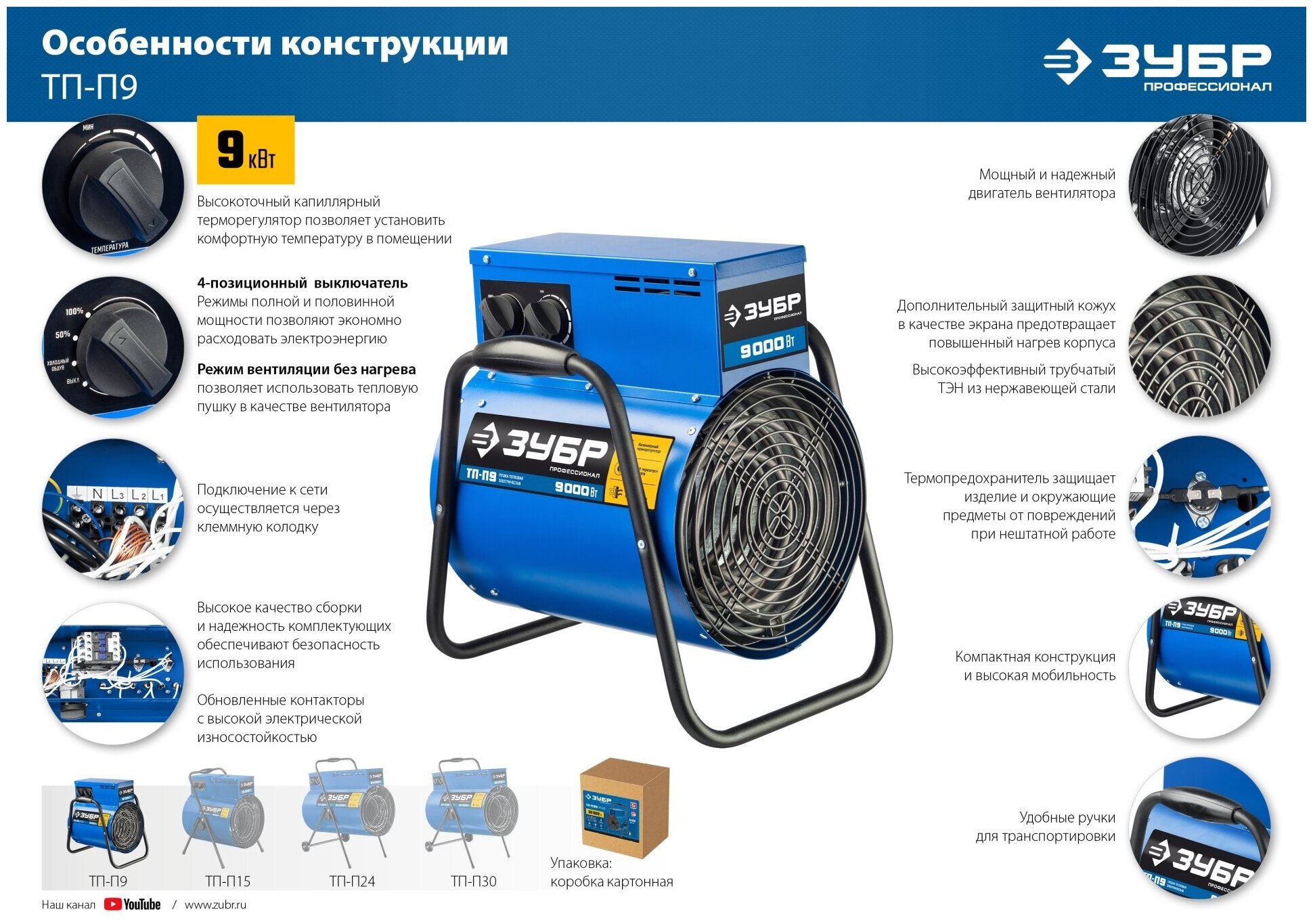 Электрическая тепловая пушка ЗУБР ТПК-2Р, предназначена для эффективного обогрева квартиры, офисы, магазины, бытовки, вагончики, гаражи и т.д. Благодаря небольшим размерам тепловую пушку легко переносить и хранить. Устройства оснащены долговечным металлокерамическим нагревательный элементом, обеспечивающий быстрый равномерный нагрев, экономное потребление электроэнеергии и не сушит воздух. Механический терморегулятор поддерживает нужную температуру нагрева.За счет большой площади теплообмена и небольшой температуры нагрева элемента, воздух быстро прогревается. Изделие можно оставлять на долгое время и не бояться за сохранность помещения, так как конструктивные меры безопасности защищают Вас и изделие при нештатных ситуациях.