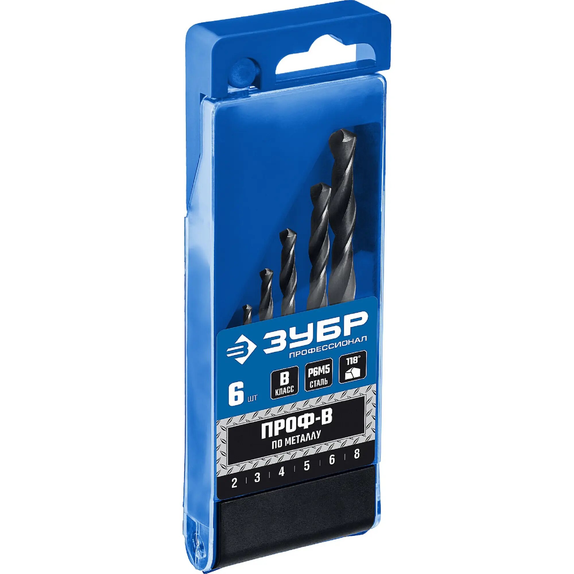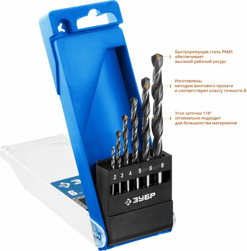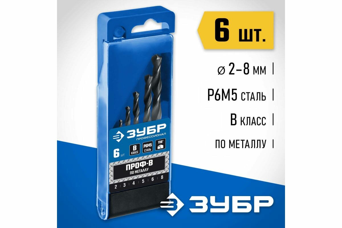 ЗУБР ПРОФ-В 6 шт (2-8 мм) сталь Р6М5 класс В набор сверл по металлу Профессионал (29621-H6)