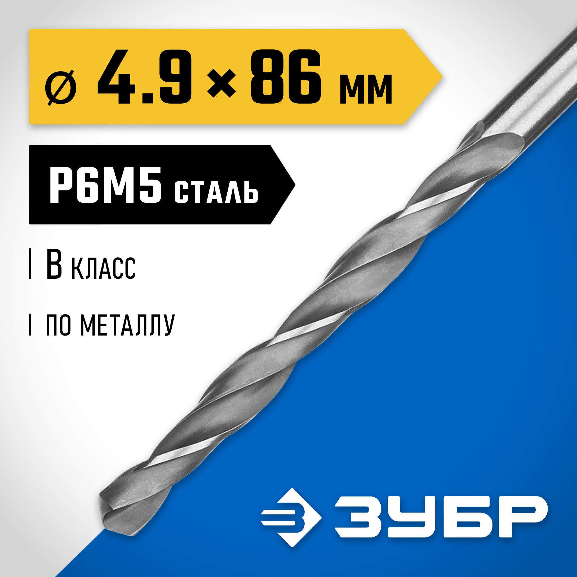 ЗУБР ПРОФ-В 4.9 х 86 мм сталь Р6М5 класс В сверло по металлу Профессионал (29621-4.9)