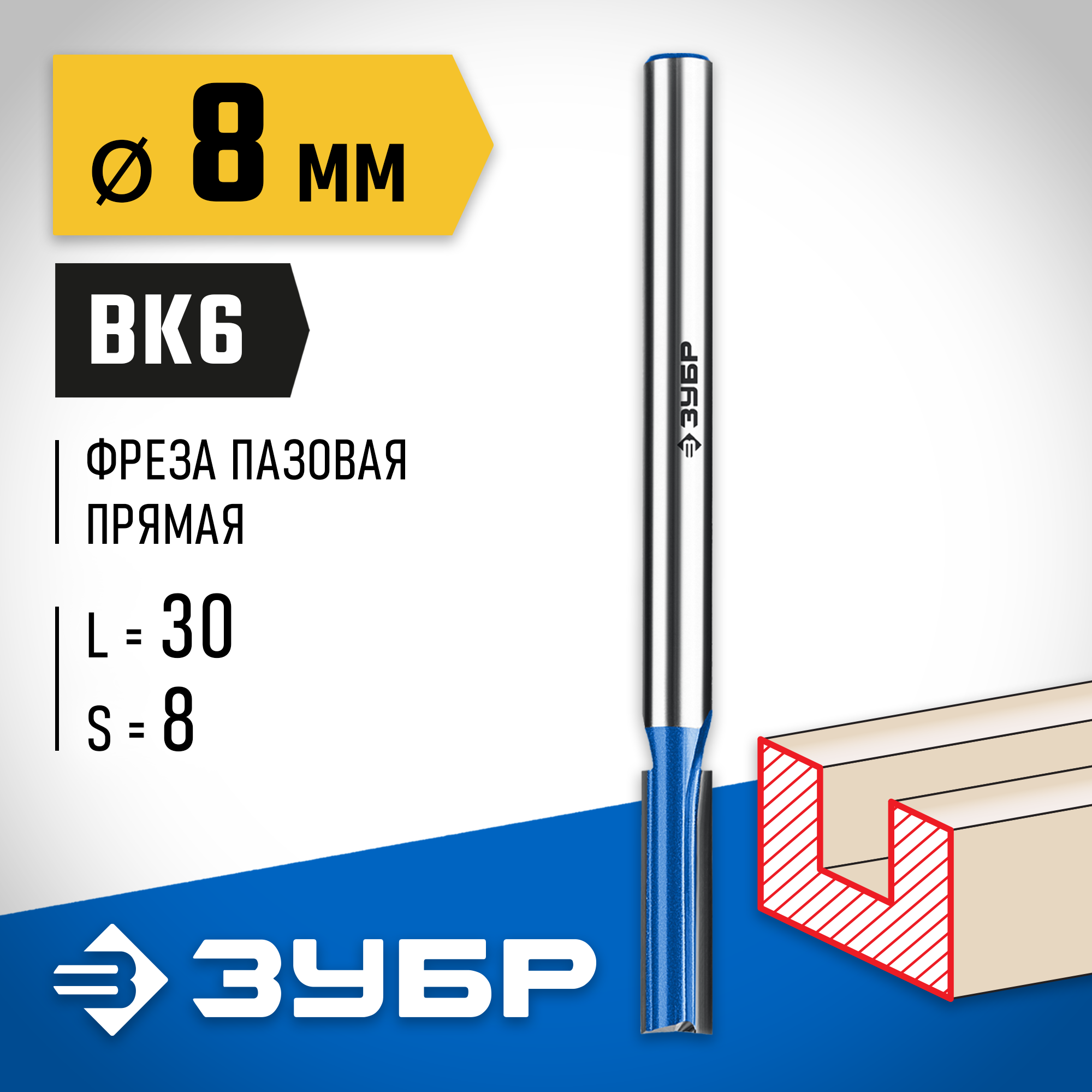ЗУБР 12 x 30 мм хвостовик 8 мм фреза пазовая прямая с нижними подрезателями Профессионал (28755-12-30)