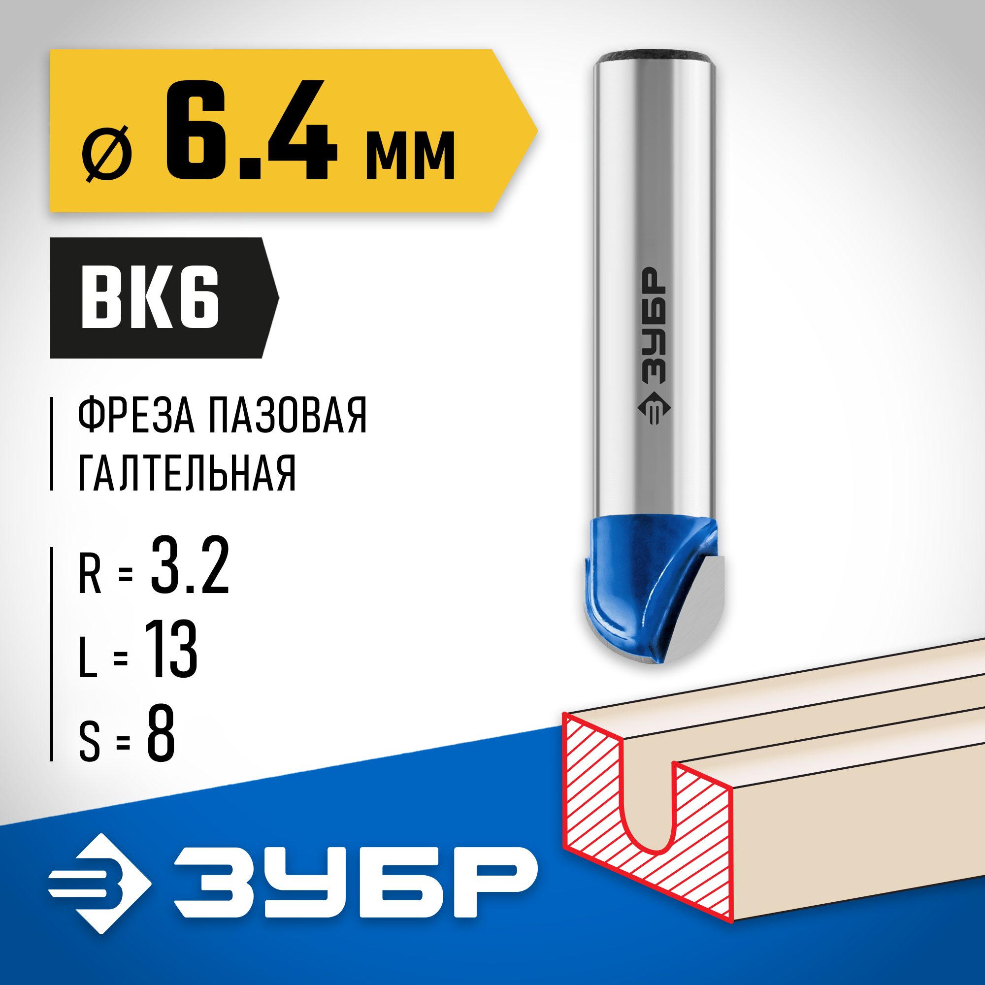 ЗУБР 6.4 x 13 мм радиус 3.2 мм фреза пазовая галтельная Профессионал (28751-6.4-13)