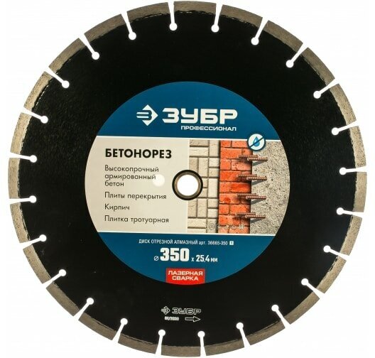 Диск алмазный отрезной профессионал бетонорез Зубр 36665-350_z01 предназначен для швонарезчиков и бензорезов. Применяется для резки бетона, кирпича, тротуарной плитки и прочих строительных материалов.