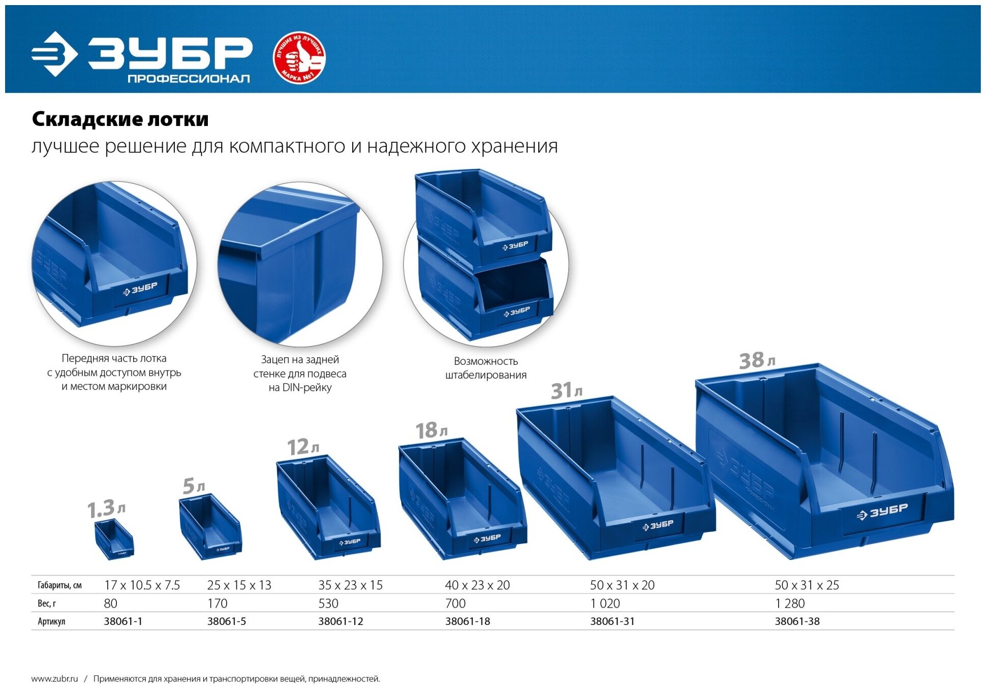 Лоток складской ЗУБР ЛСК-18 38061-18, предназначен для удобного хранения инструментов и принадлежностей и обеспечивает быстрый доступ даже к небольшому инструменту или крепежу. Компактное решение для хранения. Лотки штабелируются в несколько ярусов. Передняя часть лотка обеспечивает легкий доступ внутрь. Возможна установка лотка на планку.