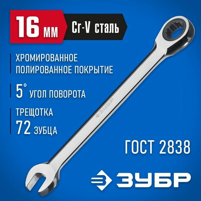 ЗУБР 16 мм комбинированный трещоточный гаечный ключ Профессионал (27074-16) (27074-16_z01)