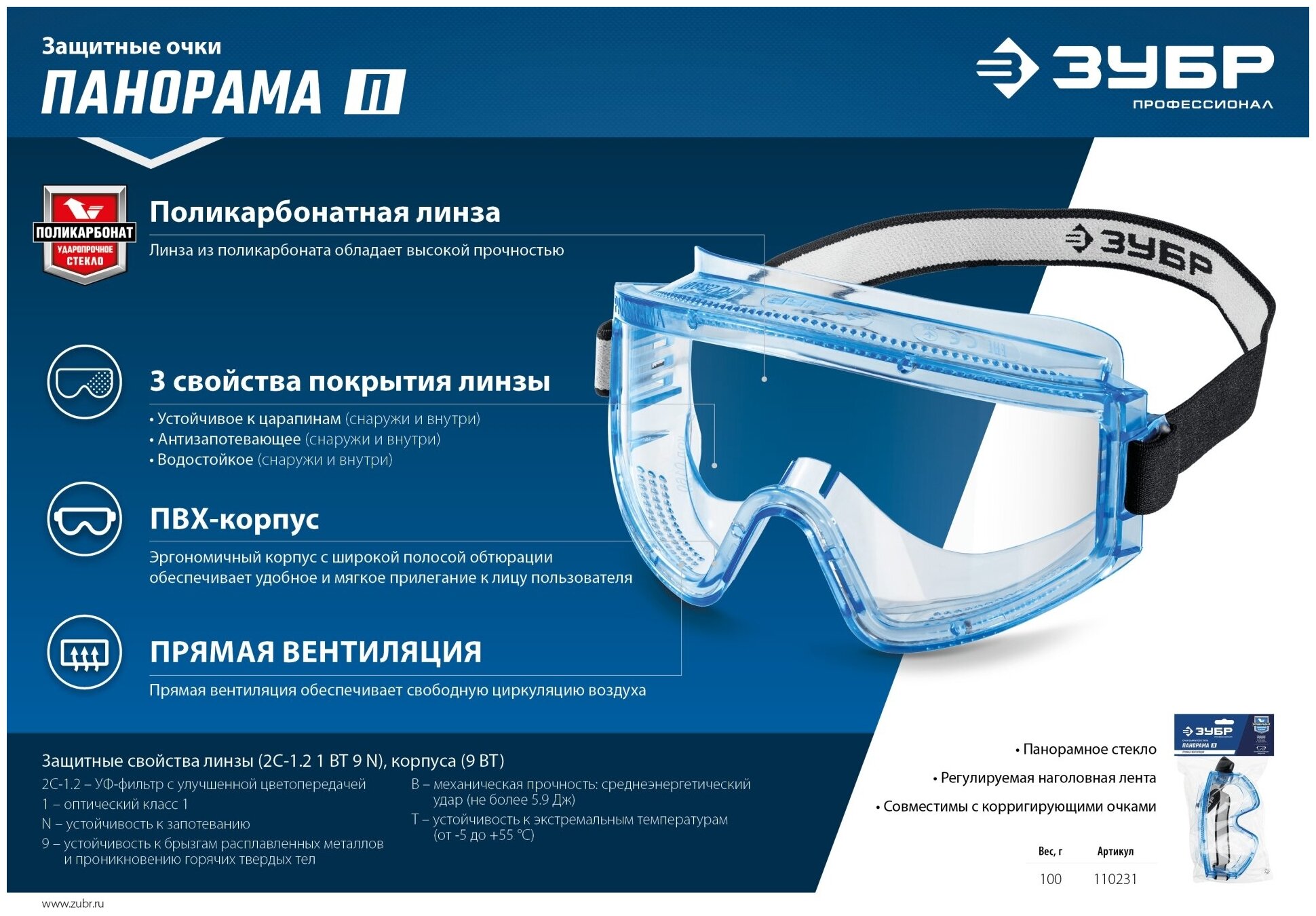 ЗУБР ПАНОРАМА П закрытого типа стекло из ударопрочного поликарбоната защитные очки с прямой вентиляцией Профессионал (110231)