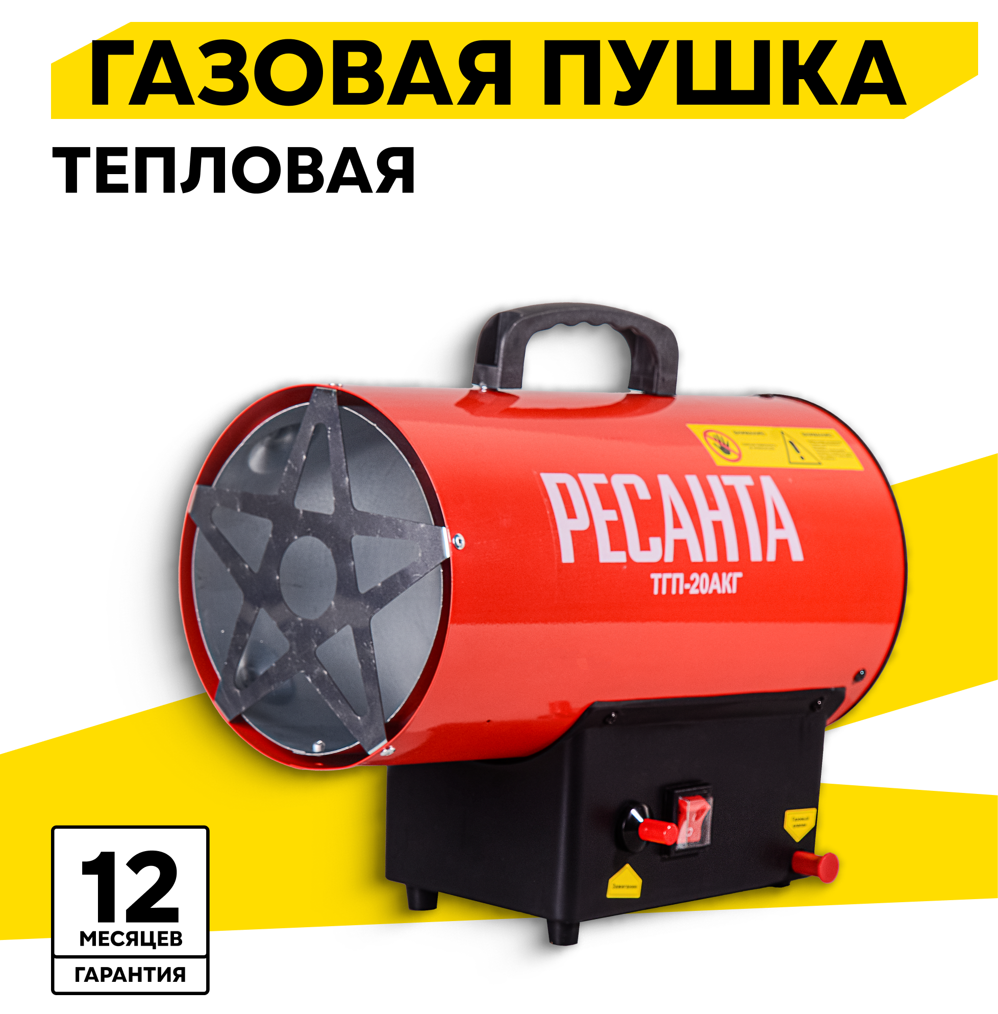 Тепловая газовая пушка Ресанта ТГП-35000 генерирует тепло с помощью открытого пламени, что обеспечивает эффективную передачу тепла и позволяет работать, экономя энергию. Надежная ручка упрощает переноску и расположена в верхней части цилиндрического корпуса. Устойчивость конструкции обеспечивают прорезиненные ножки.