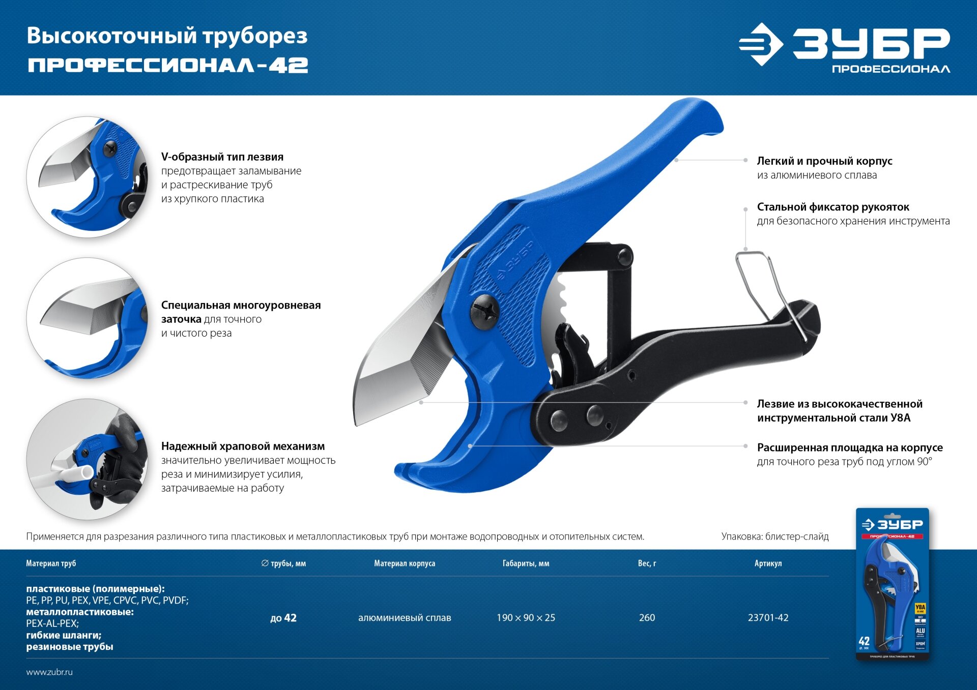 | Особенности | лезвие c V-образным острием предотвращает растрескивание труб из хрупкого пластика |