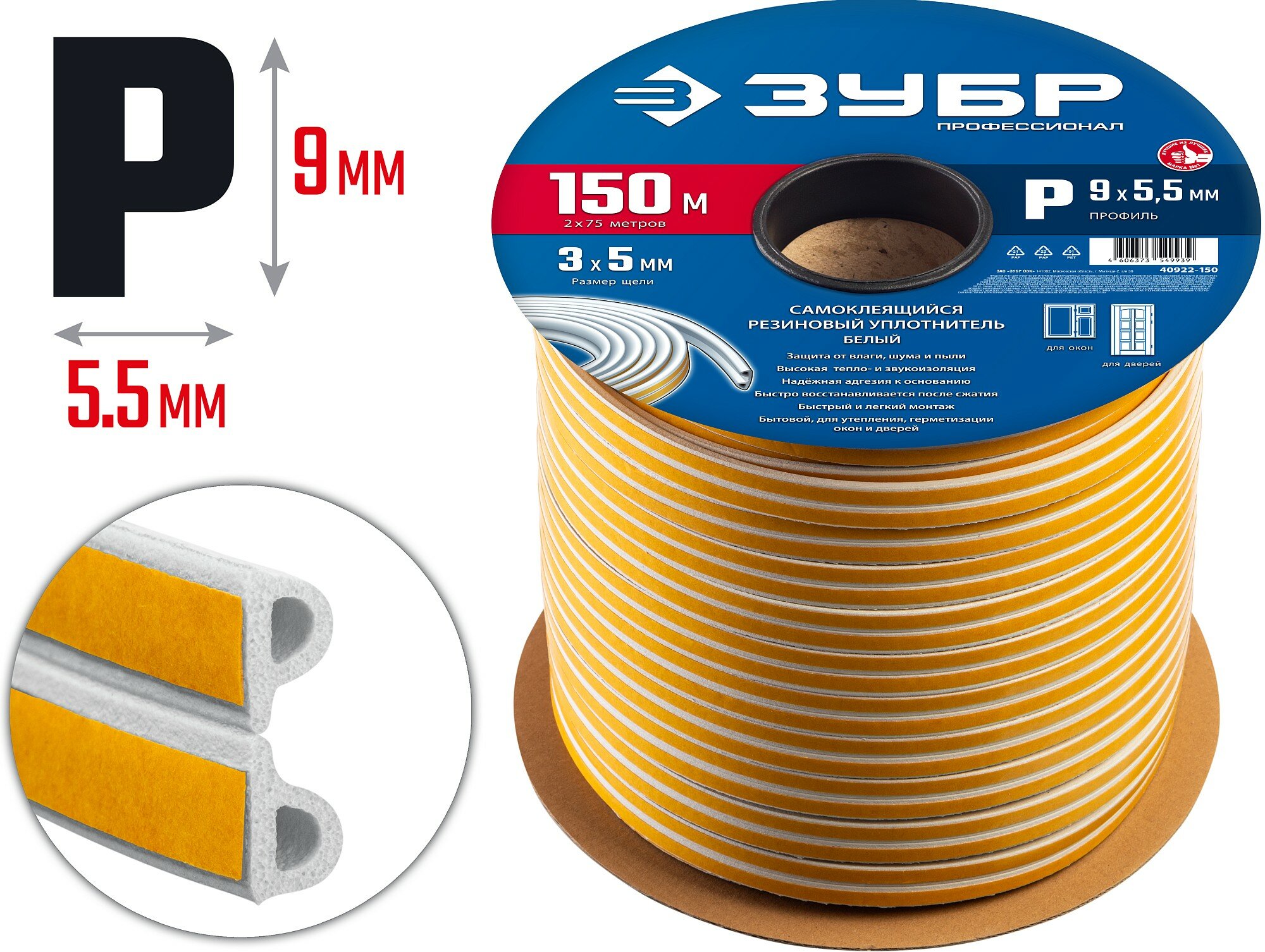 ЗУБР 150 м P-профиль размер 9 х 5.5 мм белый самоклеящийся резиновый уплотнитель Профессионал (40922-150)