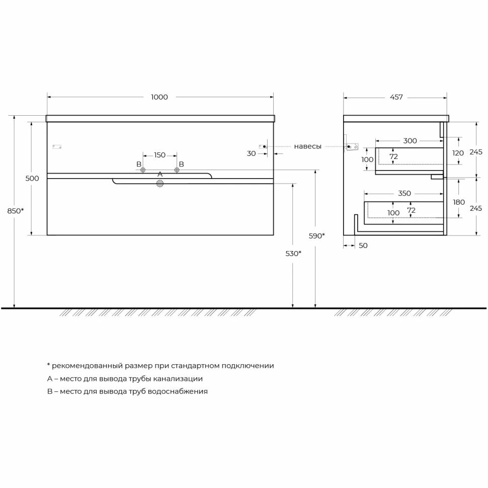 - Габариты корпуса тумбы (ШхВхД): 1000х500х457 мм.
