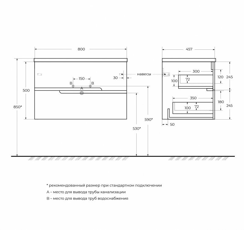 - Габариты корпуса тумбы (ШхВхД): 800х500х457 мм.
