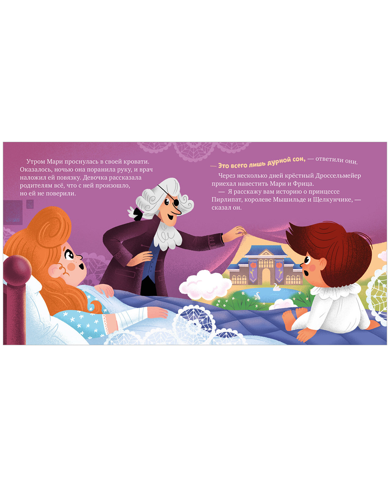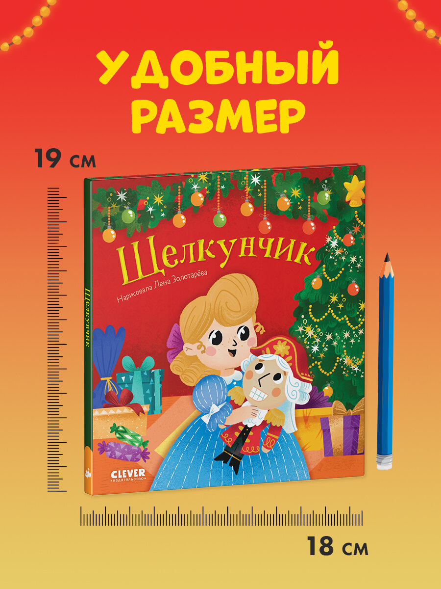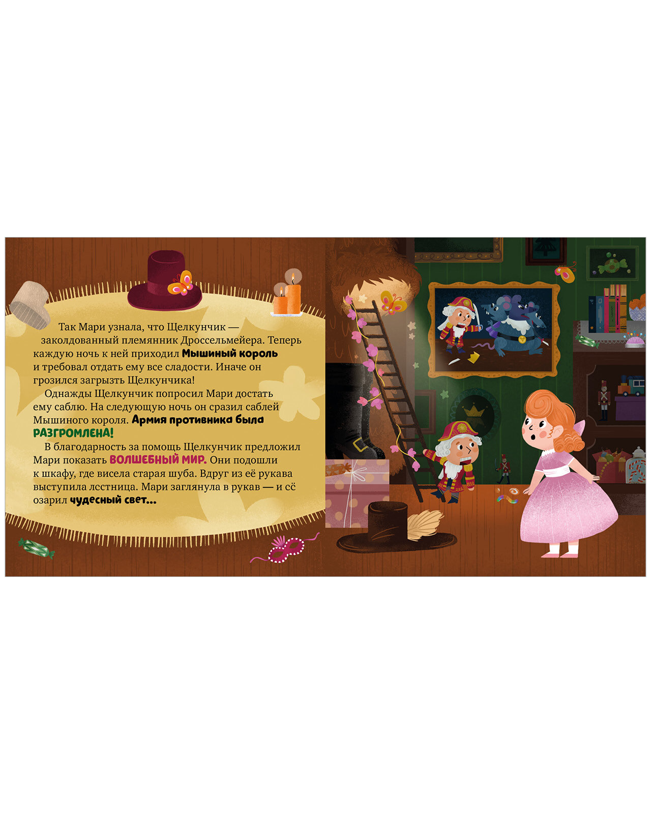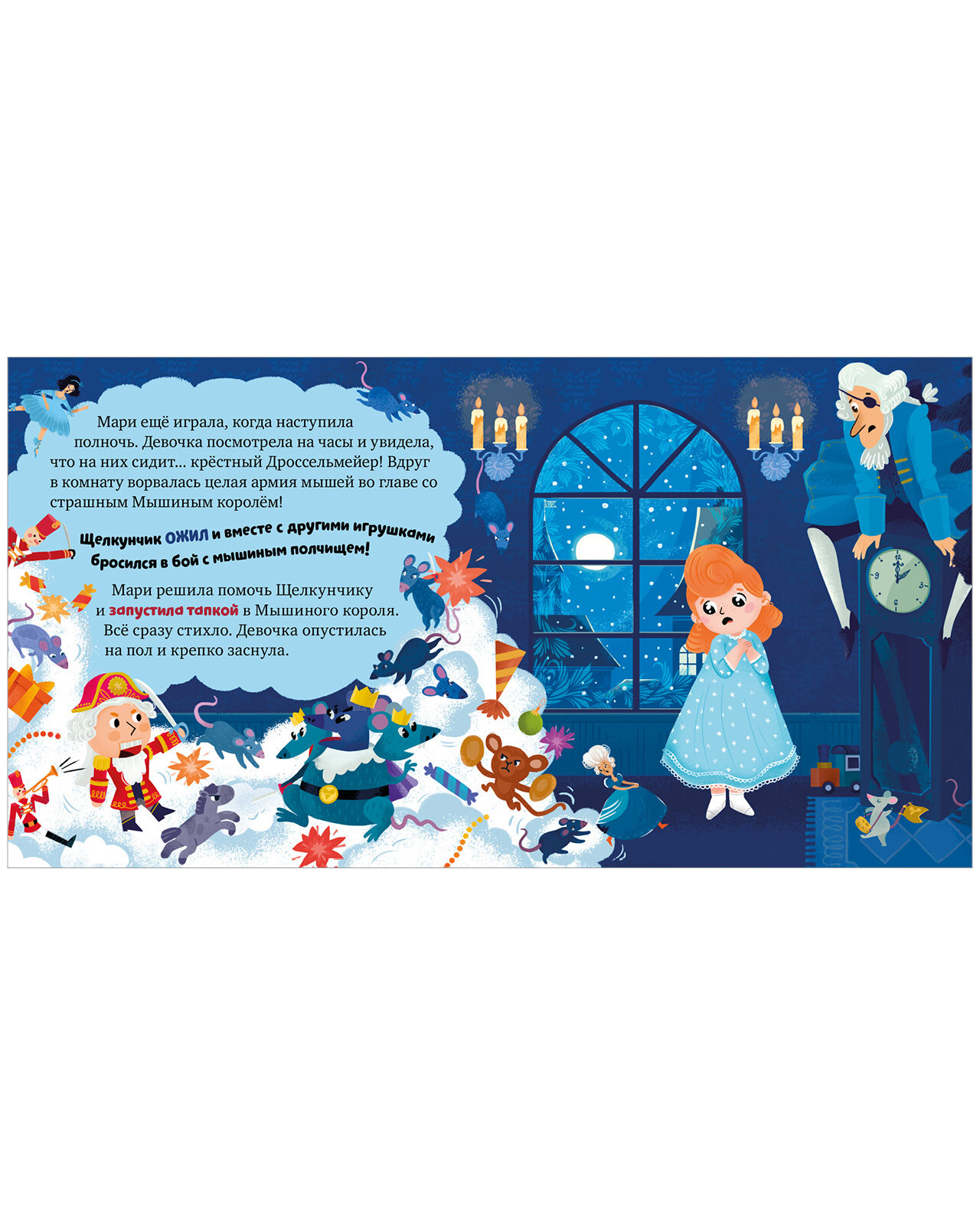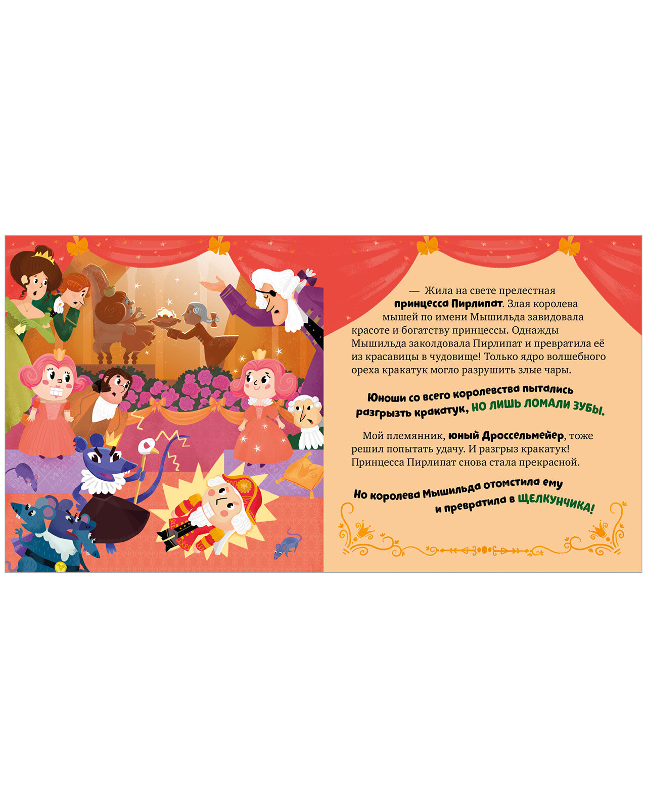 Книга для малышей расскажет легендарную сказку «Щелкунчик» простым и понятным языком и перенесет вас в волшебный мир. Глядя на яркие красочные иллюстрации, ребенку легко будет представить, как загораются огоньки на елке, как рассказывает историю о принцессе Пирлипат Дроссельмейер, как смелый Щелкунчик с помощью своей сабли побеждает огромное мышиное войско во главе с ужасным Мышиным королем и как счастливые Мари и принц-Щелкунчик заходят в волшебное Сладкое королевство, в Марципановый замок.