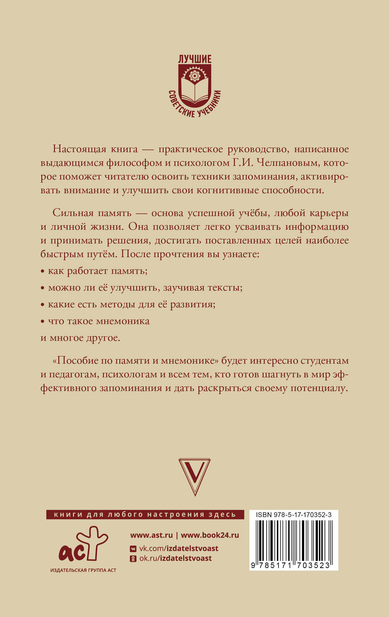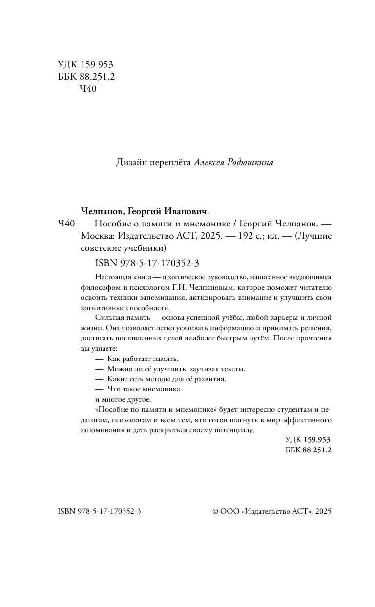 На сегодняшний день товар «Книга: Пособие по памяти и мнемонике (Георгий Иванович Челпанов); Издательство АСТ, 1930» можно купить с кешбеком в 5 магазинах: book24, ЛитРес, Буквоед, Яндекс.Маркет, Читай-город