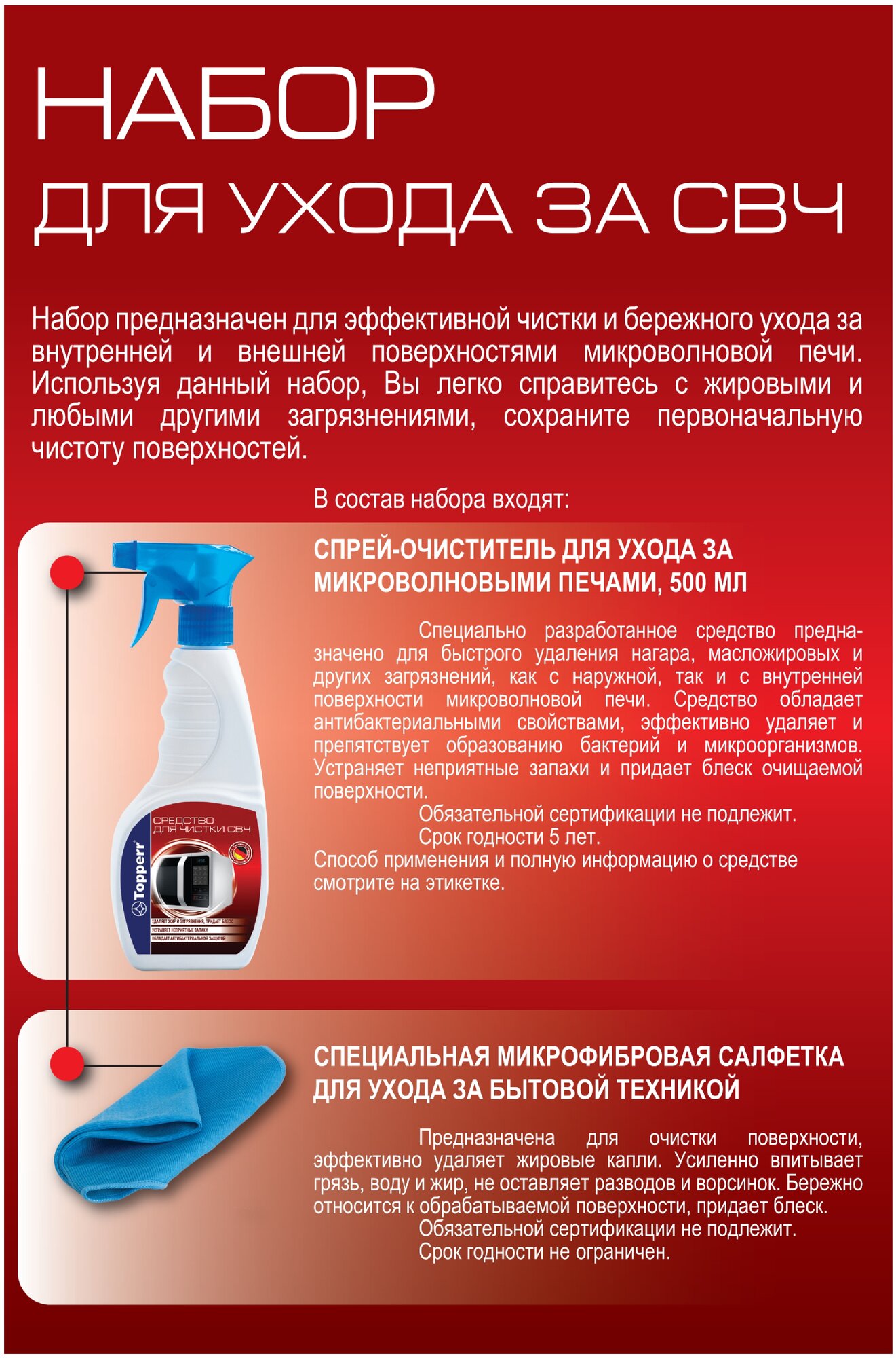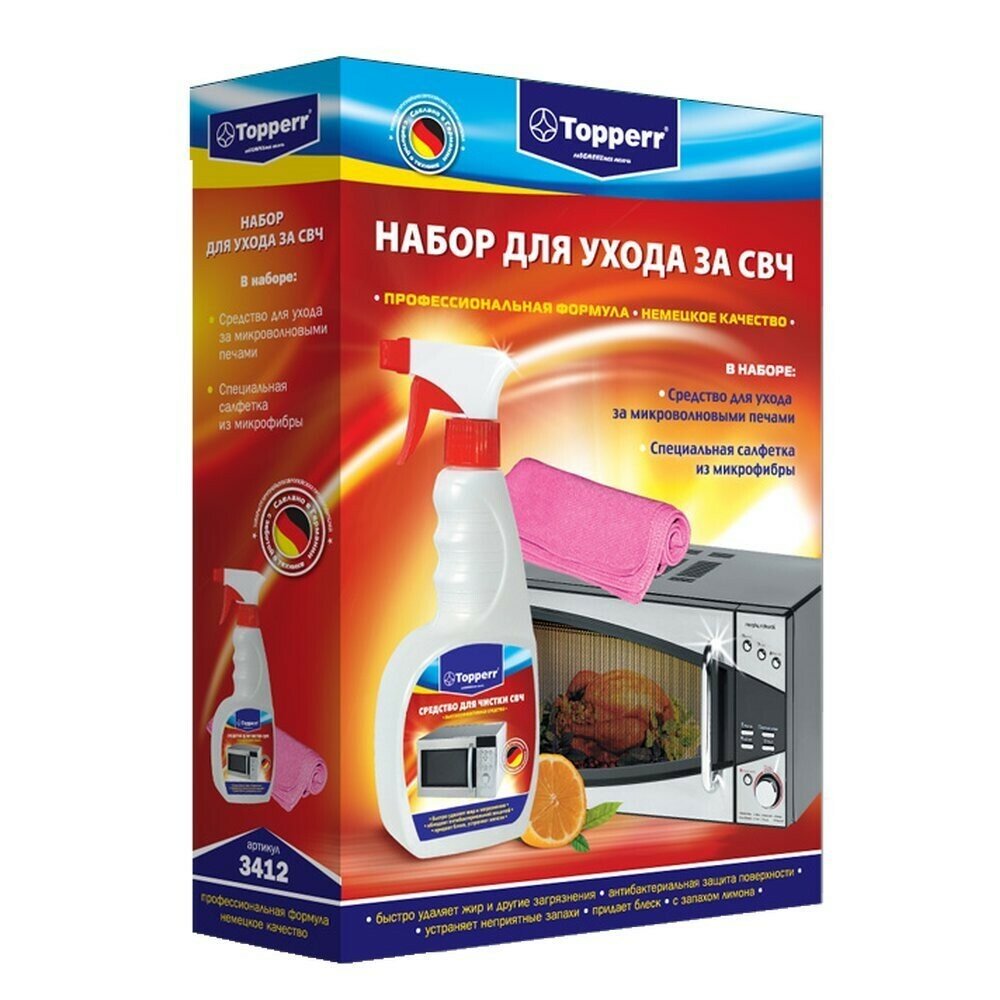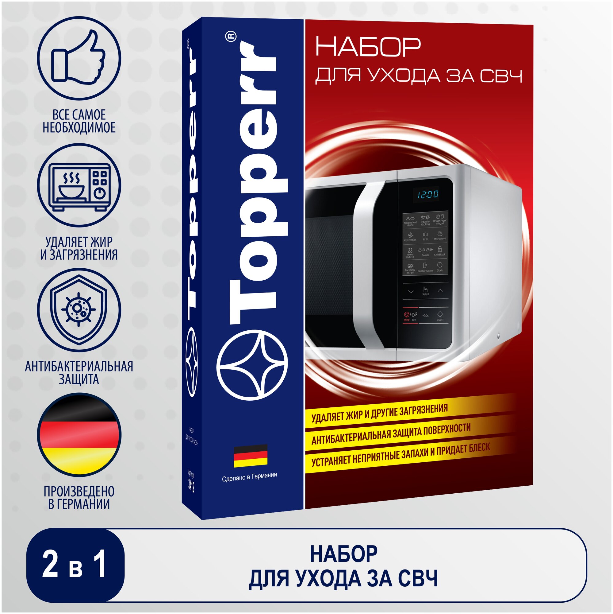 Набор "Topperr" предназначен для ухода за СВЧ. Набор включает в себя 2 предмета: - средство для ухода за СВЧ, 500 мл Предназначено для быстрого удаления нагара, масложировых и других загрязнений. Устраняет неприятные запахи и придаёт блеск очищаемой поверхности. - специальная салфетка из микрофибры Быстро и эффективно удаляет все загрязнения, не оставляет пятен, разводов и ворсинок. Набор предназначен для эффективной чистки и бережного ухода за внутренней и наружной поверхностями микроволновой печи.