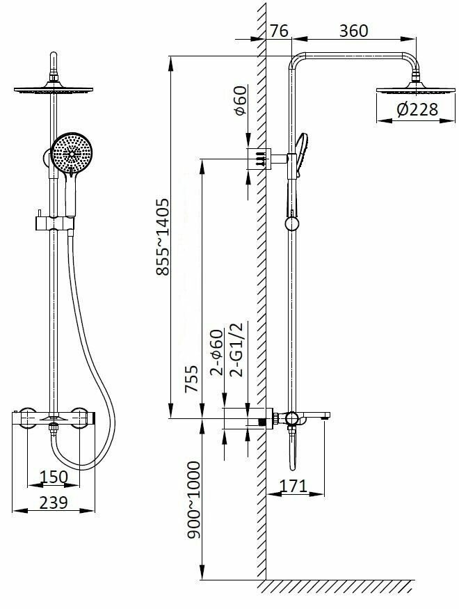 - Регулируемая по высоте душевая штанга: 855-1405 мм.