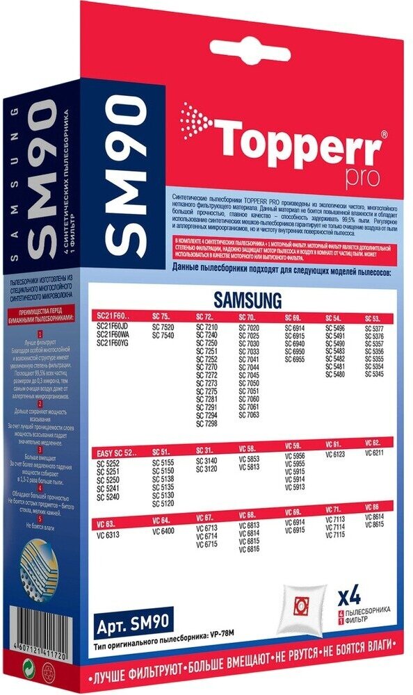 Синтетические пылесборники подходят для пылесосов Samsung произведены из экологически чистого, 4-слойного нетканого фильтрующего материала MicrofiltPlus. Данный материал не боится повышенной влажности и обладает большой прочностью, главное качество – способность задерживать 99,5% пыли. Регулярное использование синтетических мешков-пылесборников гарантирует не только очищение воздуха от пыли и аллергенных микроорганизмов, но и чистоту внутренних поверхностей пылесоса.