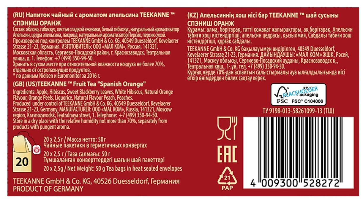 Насыщенный фруктовый чай Teekanne spanish orange с гибискусом, травами, цитрусом и яблоком представляет собой идеальное сочетание вкуса и аромата. Сохраняйте его в сухом месте при оптимальной относительной влажности, чтобы наслаждаться яркими оттенками душистого напитка каждый день.