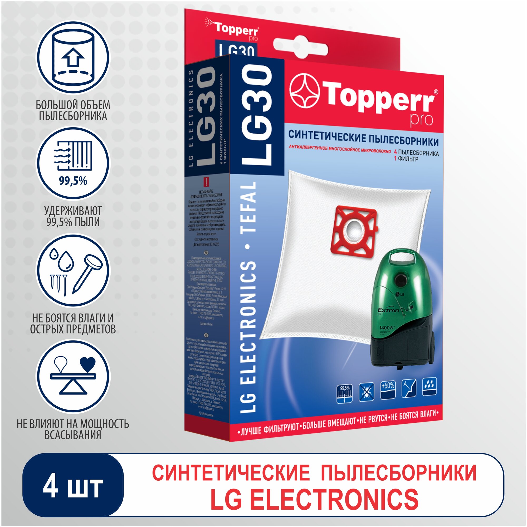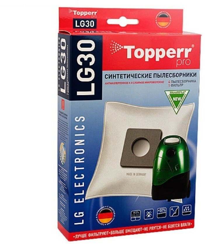 Синтетические пылесборники подходят для пылесосов LG ELECTRONICS произведены из экологически чистого, 4-слойного нетканого фильтрующего материала MicrofiltPlus. Данный материал не боится повышенной влажности и обладает большой прочностью, главное качество – способность задерживать 99,5% пыли. Регулярное использование синтетических мешков-пылесборников гарантирует не только очищение воздуха от пыли и аллергенных микроорганизмов, но и чистоту внутренних поверхностей пылесоса.