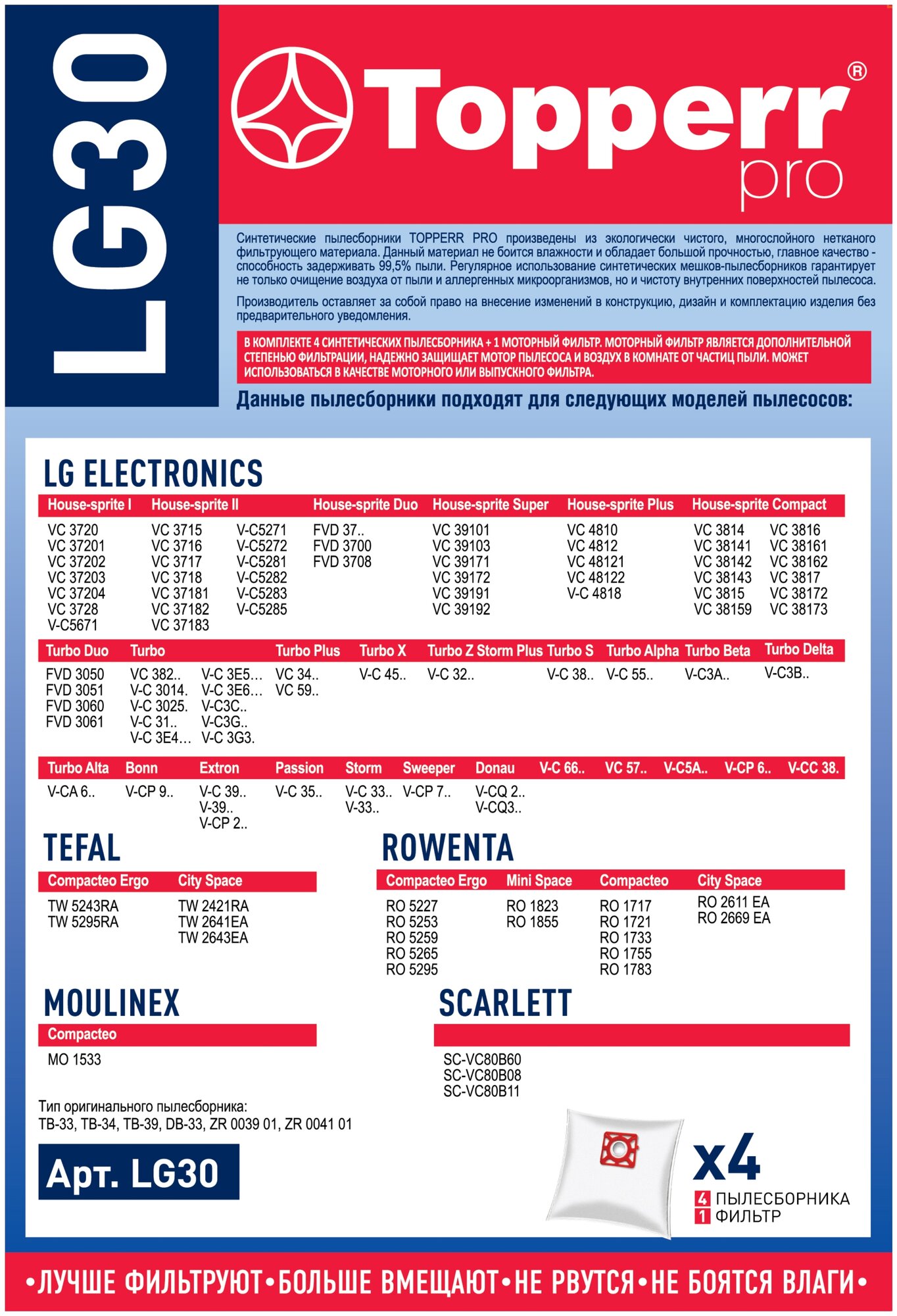 | Прочие особенности и свойства | Синтетические пылесборники подходят для пылесосов LG ELECTRONICS, TEFAL, ROWENTA, MOULINEX, SCARLETT произведены из нетканого фильтрующего материала. Данный материал не боится повышенной влажности и обладает большой прочностью, главное качество – способность задерживать 99,5% пыли. Регулярное использование синтетических мешков-пылесборников гарантирует не только очищение воздуха от пыли и аллергенных микроорганизмов, но и чистоту внутренних поверхностей пылесоса.,,LG ELECTRONICS:House-sprite I VC 372., V-C56..; House-sprite II VC 371., V-C52..; House-sprite Duo FVD 37..; House-sprite Super VC 391..; House-sprite Plus VC 48..; House-sprite Compact VC 38…; Turbo Duo FVD 30..; Turbo VC 382.., V-C 3014., V-C 3025., V-C 31.., V-C 3E4…, V-C 3E5…, V-C 3E6…,V-C3C.., V-C3G..; Turbo Plus V-C 34.., VC 59..; Turbo X V-C 45.., Turbo Z Storm Plus V-C 32.., Turbo S V-C 38..; Turbo Alpha V-C 55..; Turbo Beta V-C3A..; Turbo Delta V-C3B..; Turbo Alta V-CA 6..; Bonn V-CP 9..; Extron V-C 39.., V-39.., V-CP 2..; Passion V-C 35..; Storm V-C 33.., V-33..; Sweeper V-CP 7..; Donau V-CQ 2.., V-CQ3..; V-C 66..; VC 57..; V-C5A..; V-CP 6..; V-CC 38.,,TEFAL:City Space |