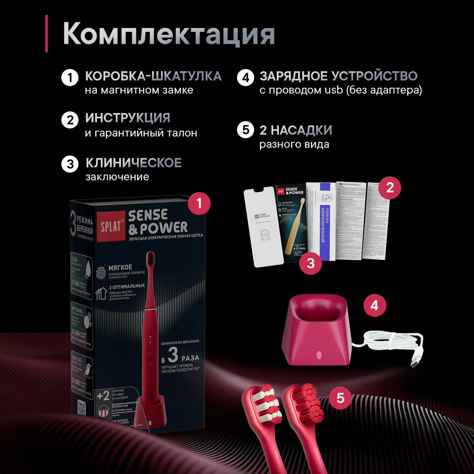 Электрическая звуковая зубная щетка SPLAT Sense Power: стиль, технологии и здоровье зубов в одном устройстве. До 41 000 движений в минуту, многофункциональные режимы и долговечная батарея.