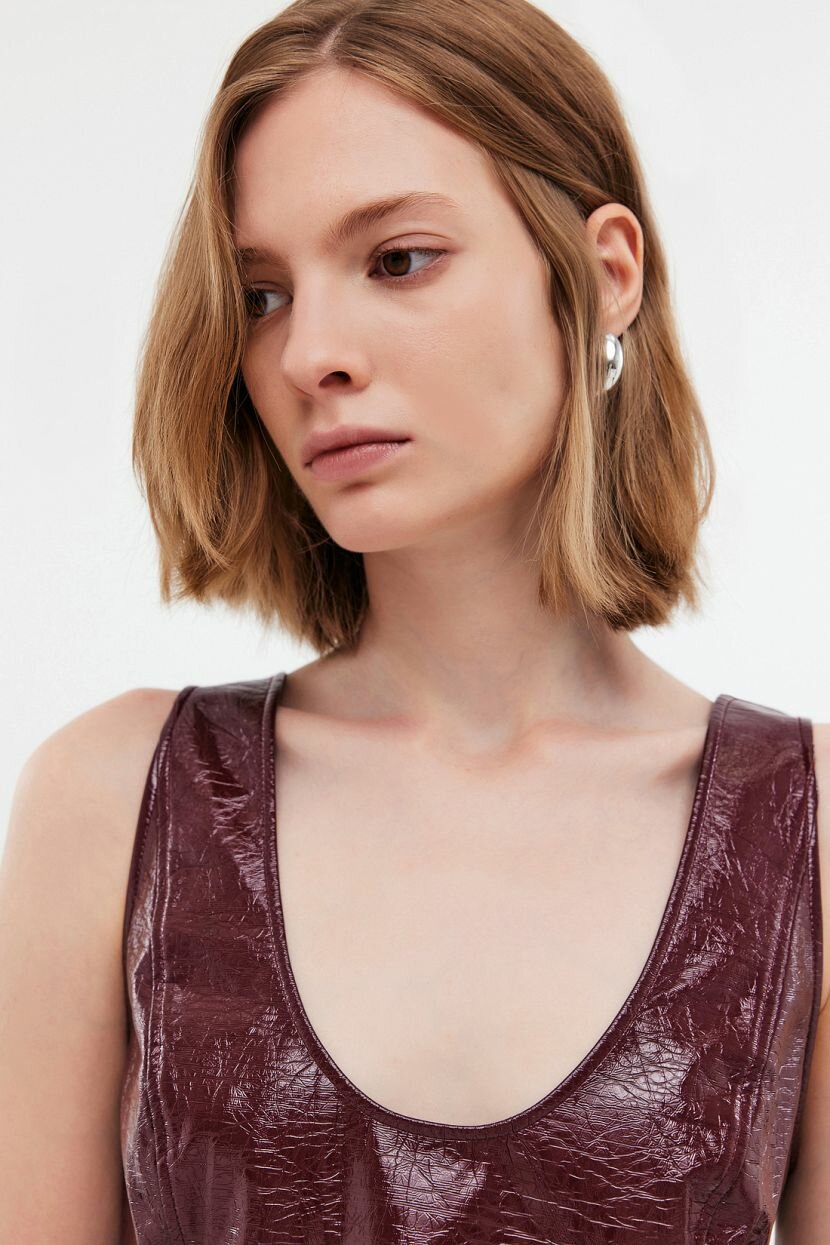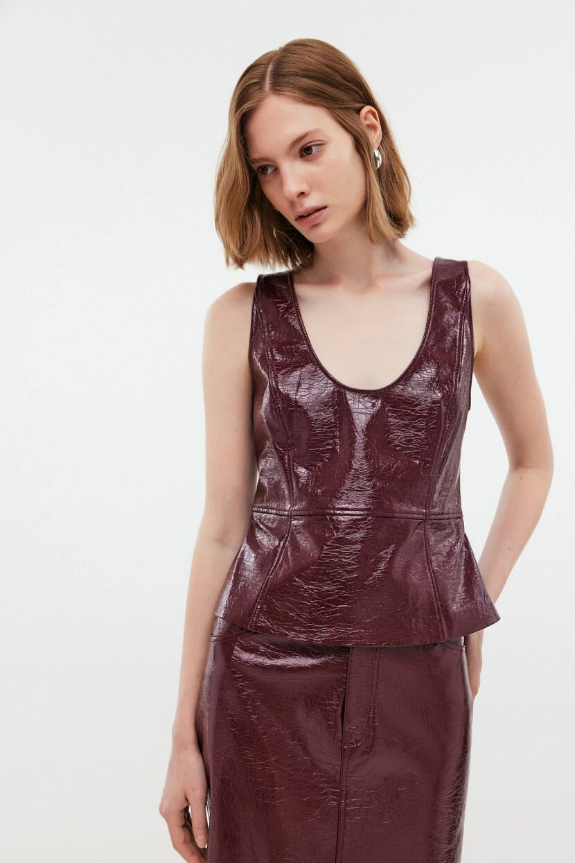 Вечерний топ без рукавов из экокожи - модный тренд, который станет находкой для женского гардероба. Стильный лаконичный дизайн позволяет интегрировать изделие в праздничные и повседневные образы. Его можно стилизовать для офиса и деловых аутфитов. Допустимо носить соло или в составе многослойного комплекта. Не сковывает движений, наделяя уверенностью. Вырез горловины округлой формы уравновешен глубоким вырезом по спинке. На нем расположена эластичная вставка для удобства ношения. Вытачки в области талии и груди придают силуэту плавность. Модель выполнена из материала, имитирующего кожу. Роскошная фактура и интересный оттенок привлекают внимание. Блузка входит в лимитированную коллекцию WHY NOT?. Ее философия заключается в том, что быть элегантной легко и комфортно.