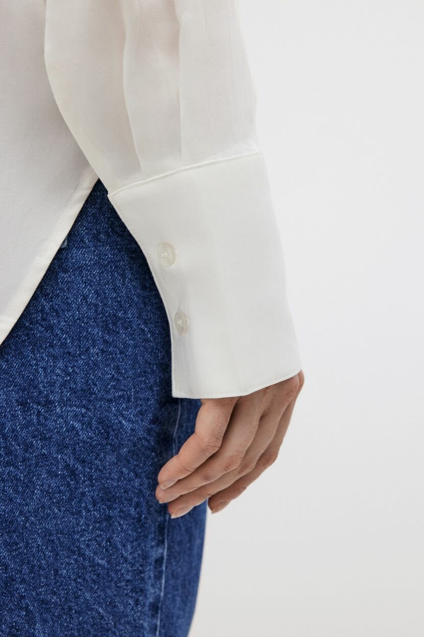 Эта блузка расслабленного силуэта выполнена из вискозы, что делает ее максимально комфортной. Модель без воротника оснащена стильным V-образным вырезом с аккуратной складкой, что придает изделию элегантность и легкость. Спущенный длинный рукав завершается манжетами на пуговицах, добавляя утонченность образу. Закругленная линия низа позволяет носить её как заправленной, так и навыпуск, создавая множество вариантов для сочетаний.Особенность конструкции в спущенном длинном рукаве делает эту вещь универсальной и удобной для ежедневного использования. Блузка мягкая на ощупь и приятная к телу, что делает её идеальной для долгих рабочих дней в офисе или прогулок по городу. V-образный вырез горловины визуально удлиняет шею и акцентирует внимание на ключицах.