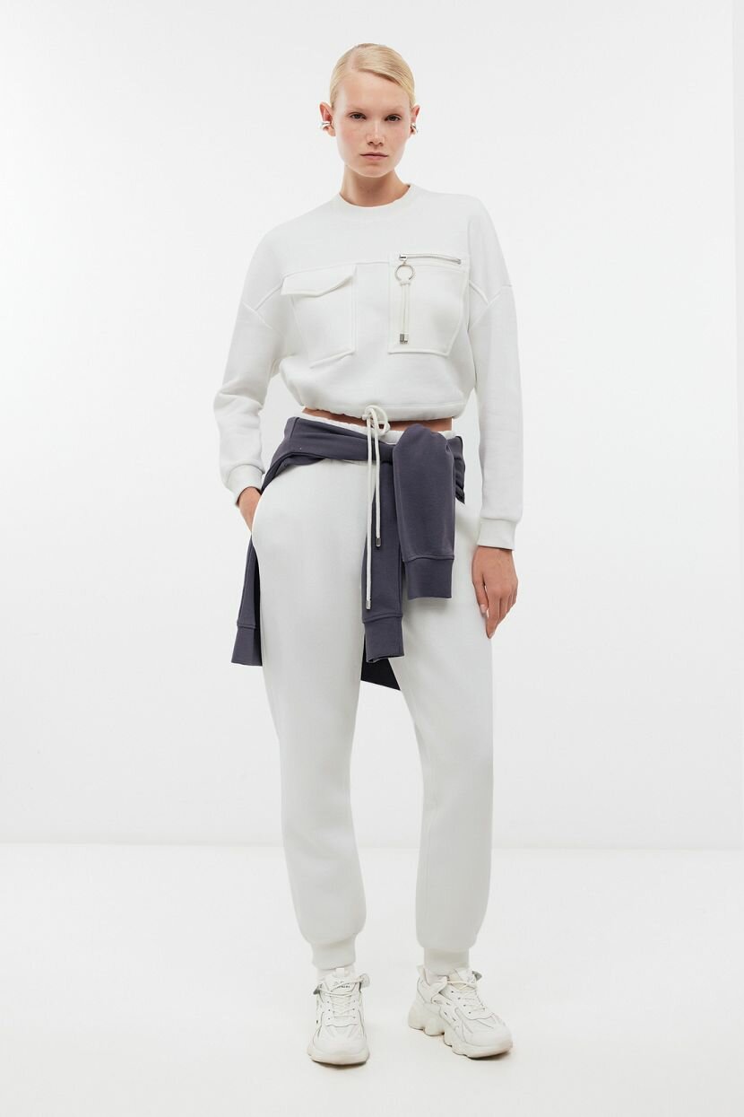 Толстовка - олицетворение стиля и женственности, которое найдет отклик в повседневных образах для прогулок и неформальных мероприятий. Прямой силуэт красиво садится по фигуре. Кофта с длинным рукавом утягивается по низу. Круглый вырез горловины окантован рибом, что препятствует потере формы. Приспущенная линия плеча добавляет мягкости. Манжеты из фактурного трикотажа плотно прилегают к рукам. В данной модели внимание привлекают интересные детали такие, как асимметричные накладные карманы и фурнитура на одном из них. Джемпер выполнен из мягкого хлопкового футера. Материал из хлопка обладает дышащими свойствами и приятен к телу. Небольшое добавление полиэстера обеспечивает износостойкость и сохранение презентабельного внешнего вида. Синтетические волокна облегчают уход и придают эластичность.