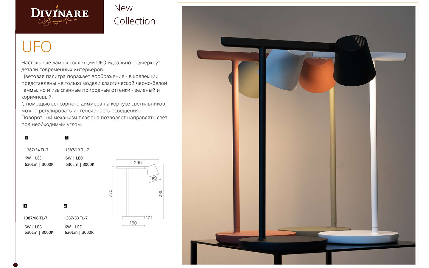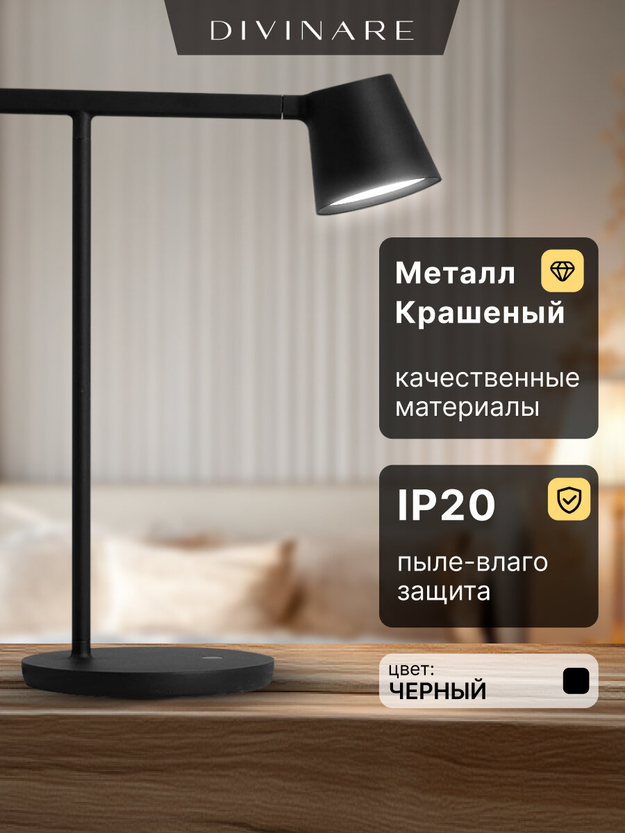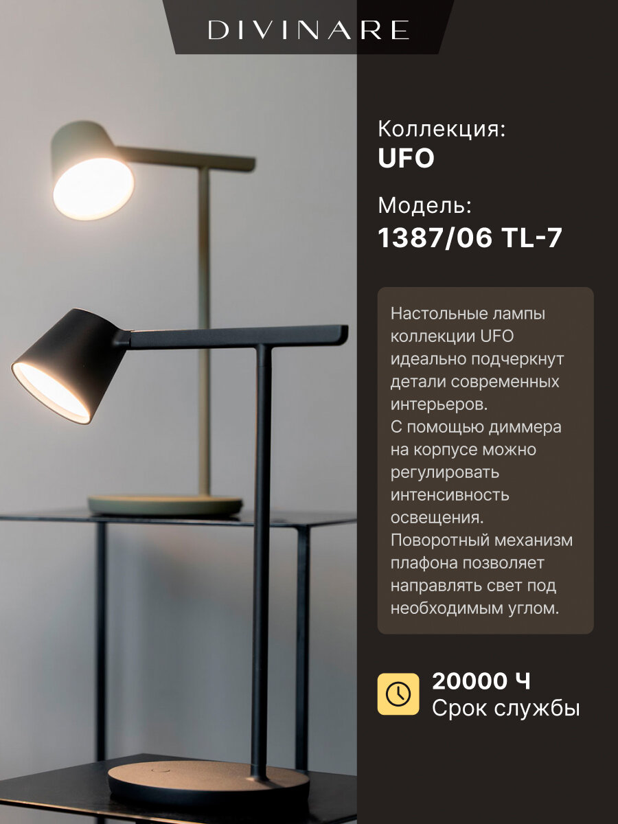 Офисная настольная лампа Divinare серии UFO в современном стиле. Подчеркнет стиль помещения. Размеры 0x29x38 cm. Параметры пылевлагозащиты IP — 20. Форма декоративная. Плафон металлический чёрный, а материал/цвет арматуры металл/чёрный. Имеются встроенные светодиодные лампы, рассчитанные на весь срок службы светильника. Площадь освещения охватывает 2 m². Идеально подходит для офиса. Страна происхождения бренда — Италия. Мощность светильника: 7Вт. Световой поток: 630Лм. Цветовая температура: 3000К. Срок службы: 20000ч.