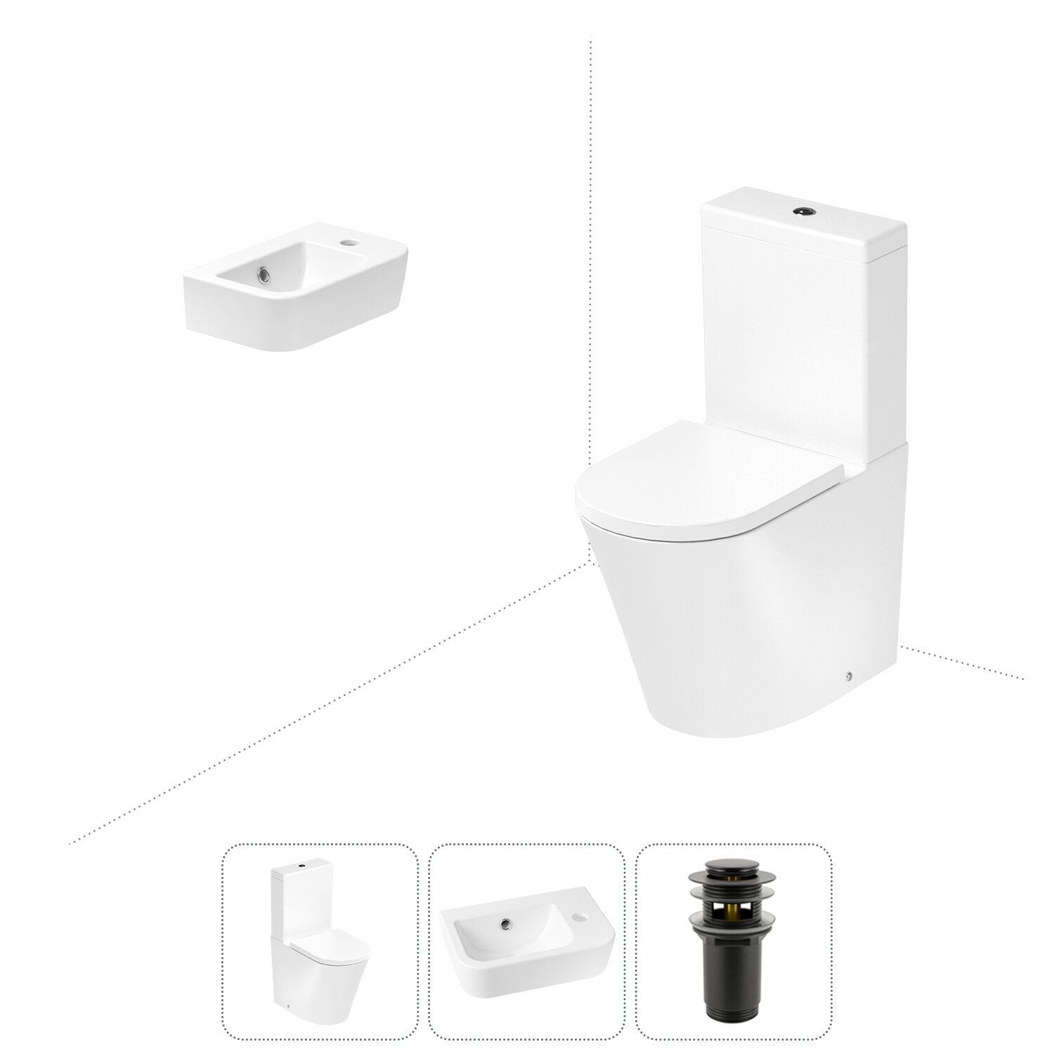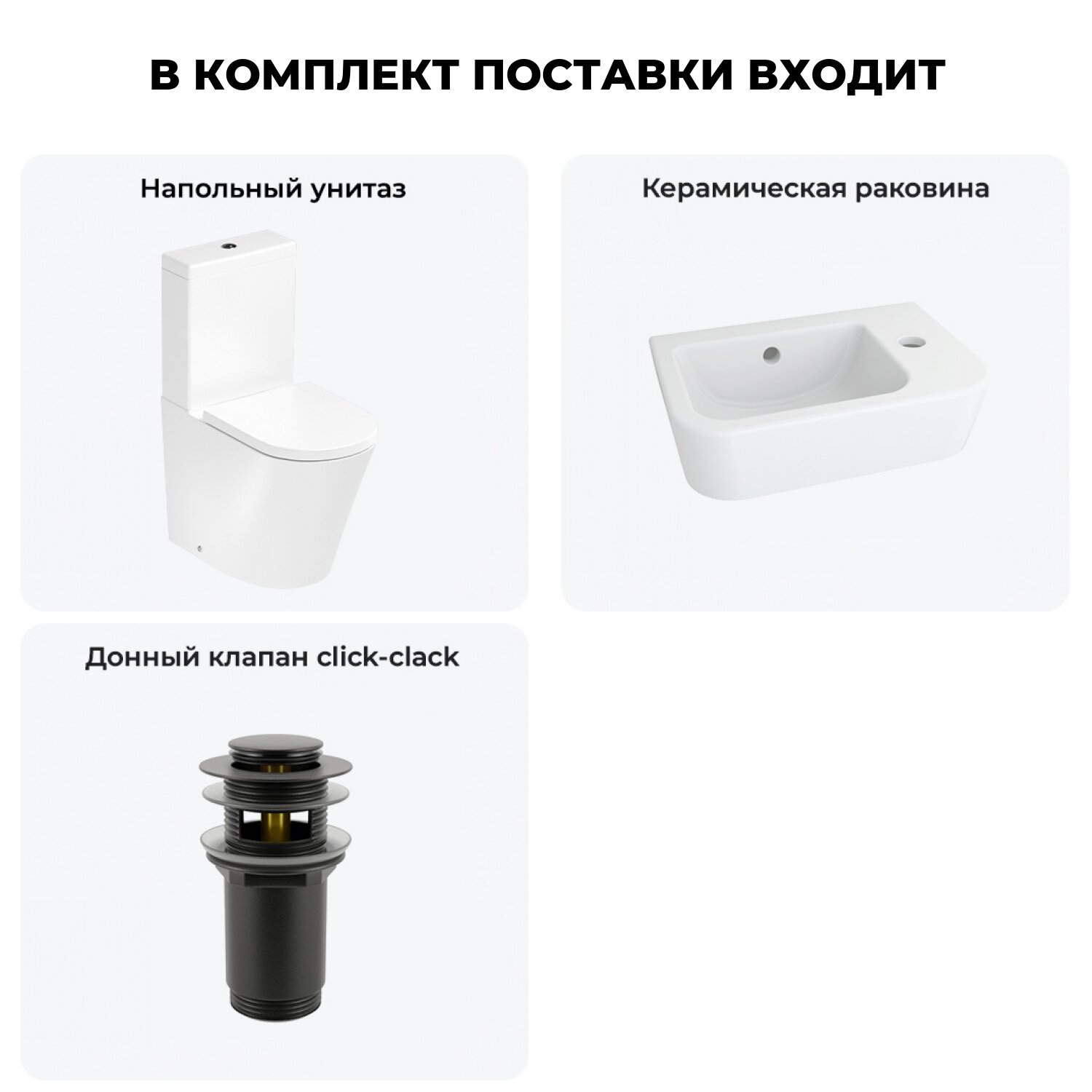 Комплексное предложение по специальной цене, включающее все необходимое для обустройства санузла / ванной комнаты.НАПОЛЬНЫЙ УНИТАЗ LAVINIA BOHOСанитарный фарфор Lavinia Boho имеет более твердую и гладкую поверхность, нежели сантехнический фаянс. Система антивсплеск увеличивает гигиеничность использования изделия и делает уборку более быстрой и простой. Антибактериальное покрытие препятствует скоплению грязи и сокращает рост бактерий.Швейцарское качество сливной арматуры Geberit гарантирует бесперебойную работу унитаза в течение как минимум 10 лет (более 200.000 циклов смыва). Латунный наполняющий и сливной клапаны производятся с помощью автоматизированного проектирования и соответствуют самым строгим требованиям надежности.КЕРАМИЧЕСКАЯ РАКОВИНАКомпактная подвесная раковина Lavinia Boho One (370 х 245 х 100) оптимально подходит для небольших ванных комнат или гостевых санузлов. Конструкция чаши умывальника и расположение смесителя позволяют максимально избежать брызг воды при использовании изделия. Сливное отверстие раковины и точно выверенный угол уклона, обеспечивают слив до 30 литров воды в минуту, что позволяет использовать умывальник без ограничений мощности потока и опасения перелива воды.ГОТОВОЕ РЕШЕНИЕ ДЛЯ ТУАЛЕТНОЙ КОМНАТЫДизайнерская сантехника изготовлена в едином стиле: изделия прекрасно дополняют друг друга и формируют органичный тандем с латунными сифонами, донными клапанами, выпусками, угловыми вентилями и элегантными аксессуарами.Комплектация: безободковая чаша напольного унитаза c декоративными колпачками для креплений Lavinia Boho Biore Rimless 3304203R; бачок унитаза с 2-х режимной сливной арматурой Lavinia Boho Biore 33043040 (Geberit, Швейцария); быстросъемное сиденье микролифт из прочного дюропласта с хромированными металлическими петлями Lavinia Boho Biore 33290410; керамическая раковина с декоративным кольцом на перелив Lavinia Boho One 33310001R (размер 37*24,5 см, отверстие под смеситель справа); донный клапан для раковины Wellsee Drainage System 182130000 (цвет матовый черный); комплект креплений; инструкция по монтажу и эксплуатации; гарантийный талон.Внимание! Пожалуйста, посмотрите все изображения к товару и найдите фото, помогающее правильно определить угол поворота. Данная модель с правым R-разворотом. Пожалуйста, убедитесь в правильности выбора нужной стороны.