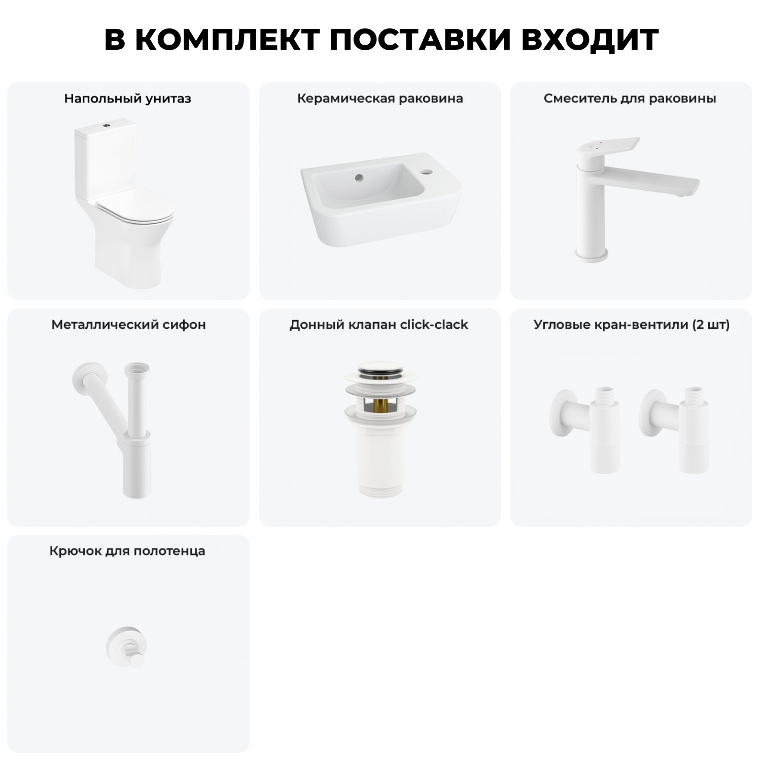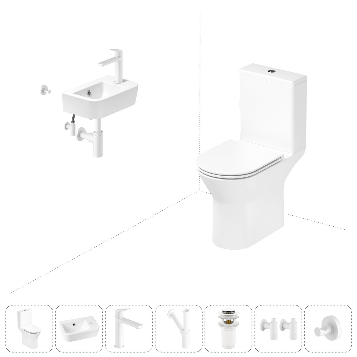 Комплексное предложение по специальной цене, включающее все необходимое для обустройства санузла / ванной комнаты.ГОТОВОЕ РЕШЕНИЕ ДЛЯ ТУАЛЕТНОЙ КОМНАТЫСанитарный фарфор Lavinia Boho имеет более твердую и гладкую поверхность, нежели сантехнический фаянс. Система антивсплеск увеличивает гигиеничность использования изделия и делает уборку более быстрой и простой. Антибактериальное покрытие препятствует скоплению грязи и сокращает рост бактерий. Швейцарское качество сливной арматуры Geberit гарантирует бесперебойную работу унитаза в течение как минимум 10 лет (более 200.000 циклов смыва).Компактная подвесная раковина Lavinia Boho One (370 х 245 х 100) оптимально подходит для небольших ванных комнат или гостевых санузлов. Конструкция чаши умывальника и расположение смесителя позволяют максимально избежать брызг воды при использовании изделия. Сливное отверстие раковины и точно выверенный угол уклона, обеспечивают слив до 30 литров воды в минуту.Дизайнерская сантехника изготовлена в едином стиле: изделия прекрасно дополняют друг друга и формируют органичный тандем с латунными сифонами, донными клапанами, выпусками, угловыми вентилями и элегантными аксессуарами.Комплектация: безободковая чаша напольного унитаза c декоративными колпачками для креплений Lavinia Boho Elegant Rimless 3308202R; бачок унитаза с 2-х режимной сливной арматурой Lavinia Boho Elegant 33083030 (Geberit, Швейцария); быстросъемное сиденье микролифт из прочного дюропласта с хромированными металлическими петлями Lavinia Boho Elegant 33290700; керамическая раковина с декоративным кольцом на перелив Lavinia Boho One 33310001R (размер 37*24,5 см, отверстие под смеситель справа); смеситель для раковины Wellsee ICON! for life 182305000 (цвет матовый белый); гибкая подводка для подключения смесителя 2 шт, 45 см; сифон для раковины Wellsee Drainage System 182108000 (цвет матовый белый); донный клапан для раковины Wellsee Drainage System 182133000 (цвет матовый белый); угловой вентиль 2 шт Wellsee Drainage System 182150000 (цвет матовый белый); крючок для полотенца/халата Wellsee Finishing Touch 182520000 (цвет матовый белый); комплект креплений; инструкция по монтажу и эксплуатации; гарантийный талон.Внимание! Пожалуйста, посмотрите все изображения к товару и найдите фото, помогающее правильно определить угол поворота. Данная модель с правым R-разворотом. Пожалуйста, убедитесь в правильности выбора нужной стороны.