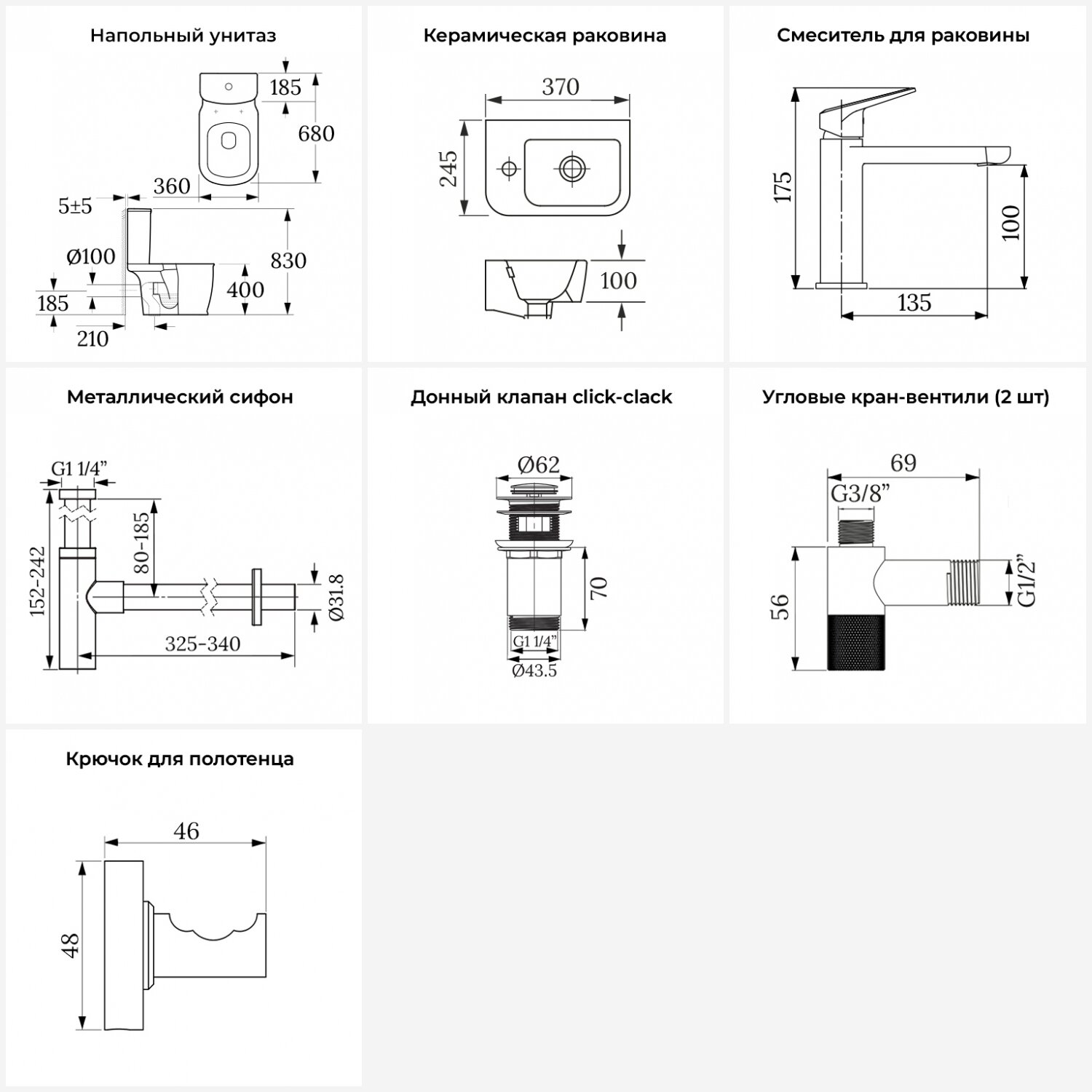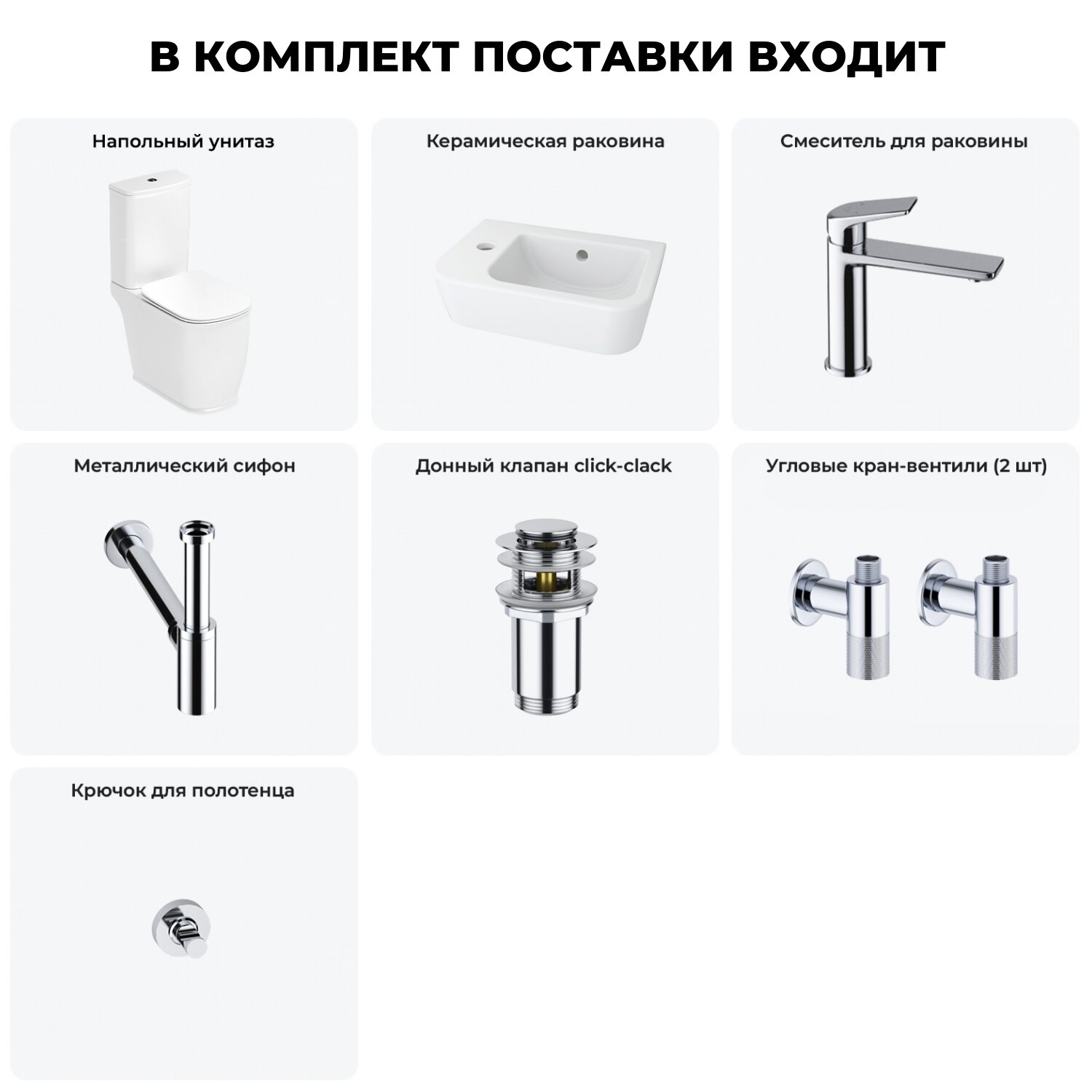 Комплексное предложение по специальной цене, включающее все необходимое для обустройства санузла / ванной комнаты.ГОТОВОЕ РЕШЕНИЕ ДЛЯ ТУАЛЕТНОЙ КОМНАТЫСанитарный фарфор Lavinia Boho имеет более твердую и гладкую поверхность, нежели сантехнический фаянс. Система антивсплеск увеличивает гигиеничность использования изделия и делает уборку более быстрой и простой. Антибактериальное покрытие препятствует скоплению грязи и сокращает рост бактерий. Швейцарское качество сливной арматуры Geberit гарантирует бесперебойную работу унитаза в течение как минимум 10 лет (более 200.000 циклов смыва).Компактная подвесная раковина Lavinia Boho One (370 х 245 х 100) оптимально подходит для небольших ванных комнат или гостевых санузлов. Конструкция чаши умывальника и расположение смесителя позволяют максимально избежать брызг воды при использовании изделия. Сливное отверстие раковины и точно выверенный угол уклона, обеспечивают слив до 30 литров воды в минуту.Дизайнерская сантехника изготовлена в едином стиле: изделия прекрасно дополняют друг друга и формируют органичный тандем с латунными сифонами, донными клапанами, выпусками, угловыми вентилями и элегантными аксессуарами.Комплектация: чаша напольного унитаза c декоративными колпачками для креплений Lavinia Boho Bell Pro 33012020; бачок унитаза с 2-х режимной сливной арматурой Lavinia Boho Bell Pro 33013030 (Geberit, Швейцария); быстросъемное сиденье микролифт из прочного дюропласта с хромированными металлическими петлями Lavinia Boho Bell Pro 33290100; керамическая раковина с декоративным кольцом на перелив Lavinia Boho One 33310001L (размер 37*24,5 см, отверстие под смеситель слева); смеситель для раковины Wellsee ICON! for life 182301000 (цвет хром); гибкая подводка для подключения смесителя 2 шт, 45 см; сифон для раковины Wellsee Drainage System 182104000 (цвет хром); донный клапан для раковины Wellsee Drainage System 182129000 (цвет хром); угловой вентиль 2 шт Wellsee Drainage System 182146000 (цвет хром); крючок для полотенца/халата Wellsee Finishing Touch 182516000 (цвет хром); комплект креплений; инструкция по монтажу и эксплуатации; гарантийный талон.Внимание! Пожалуйста, посмотрите все изображения к товару и найдите фото, помогающее правильно определить угол поворота. Данная модель с левым L-разворотом. Пожалуйста, убедитесь в правильности выбора нужной стороны.