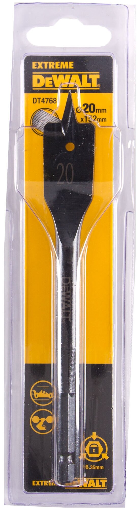 DeWALT DT4769 EXTREME - перьевое сверло для сверления больших отверстий диаметром до 22 мм в деревянных изделиях. Используется в ударных винтовертах для быстрого и точного сверления. Обладает стальным шестигранным хвостовиком, выполнено из качественной стали, благодаря чему имеет повышенную износостойкость. Скошенная внешняя кромка для чистого и очень быстрого сверления и большого срока службы.