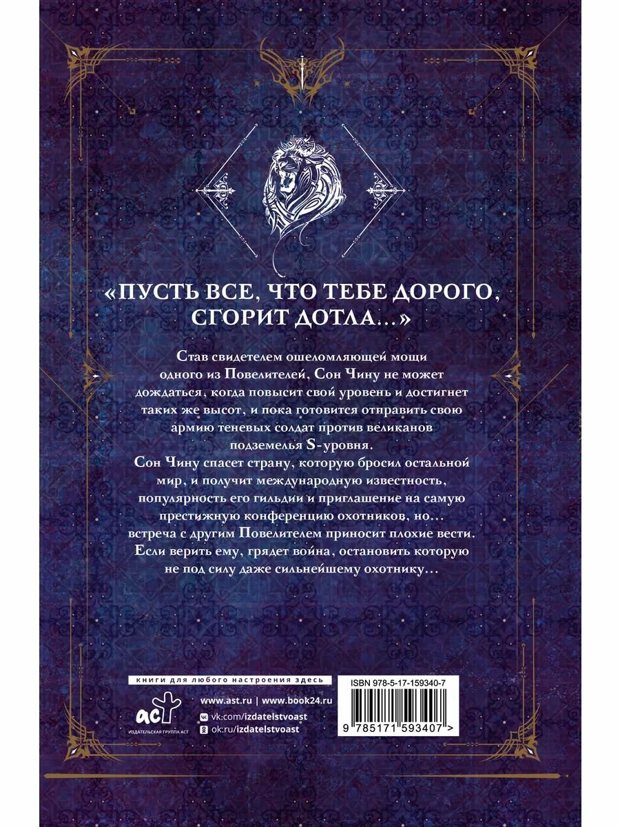 «ПУСТЬ ВСЕ, ЧТО ТЕБЕ ДОРОГО, СГОРИТ ДОТЛА…» Став свидетелем ошеломляющей мощи одного из Повелителей, Сон Чину не может дождаться, когда повысит свой уровень и достигнет таких же высот, и пока готовится отправить свою армию теневых солдат против великанов подземелья S-уровня. Сон Чину спасет страну, которую бросил остальной мир, и получит международную известность, популярность его гильдии и приглашение на самую престижную конференцию охотников, но… встреча с другим Повелителем приносит плохие вести. Если верить ему, грядет война, остановить которую не под силу даже сильнейшему охотнику…