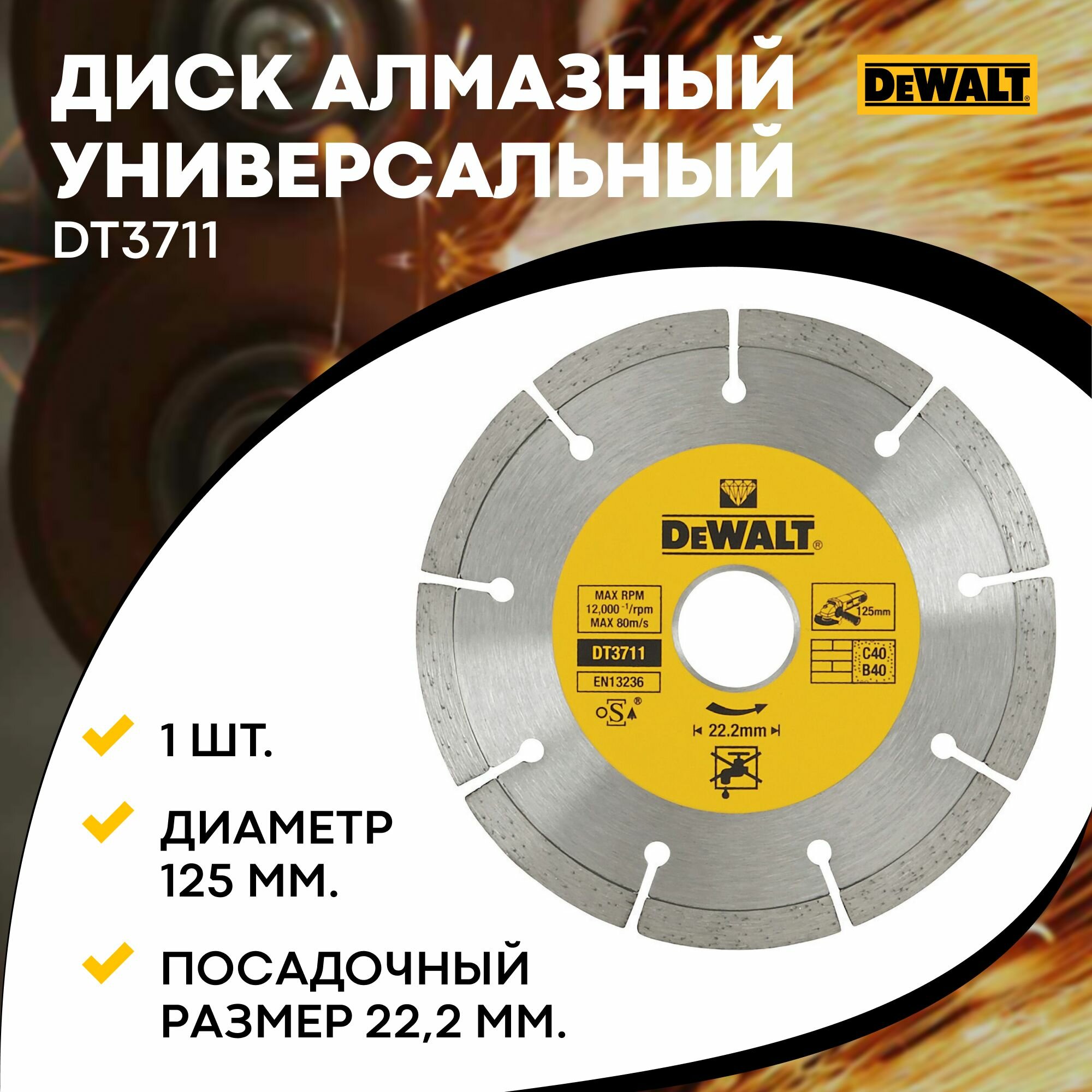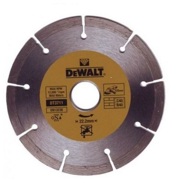 | Прочие особенности и свойства | Алмазный сегментированный диск DТ 3711 используется совместно с угловыми шлифовальными машинами для работ по основным строительным материалам. Это синтерированные диски, предназначенные для сухого реза. Благодаря сегментной кромке скорость реза высока. |