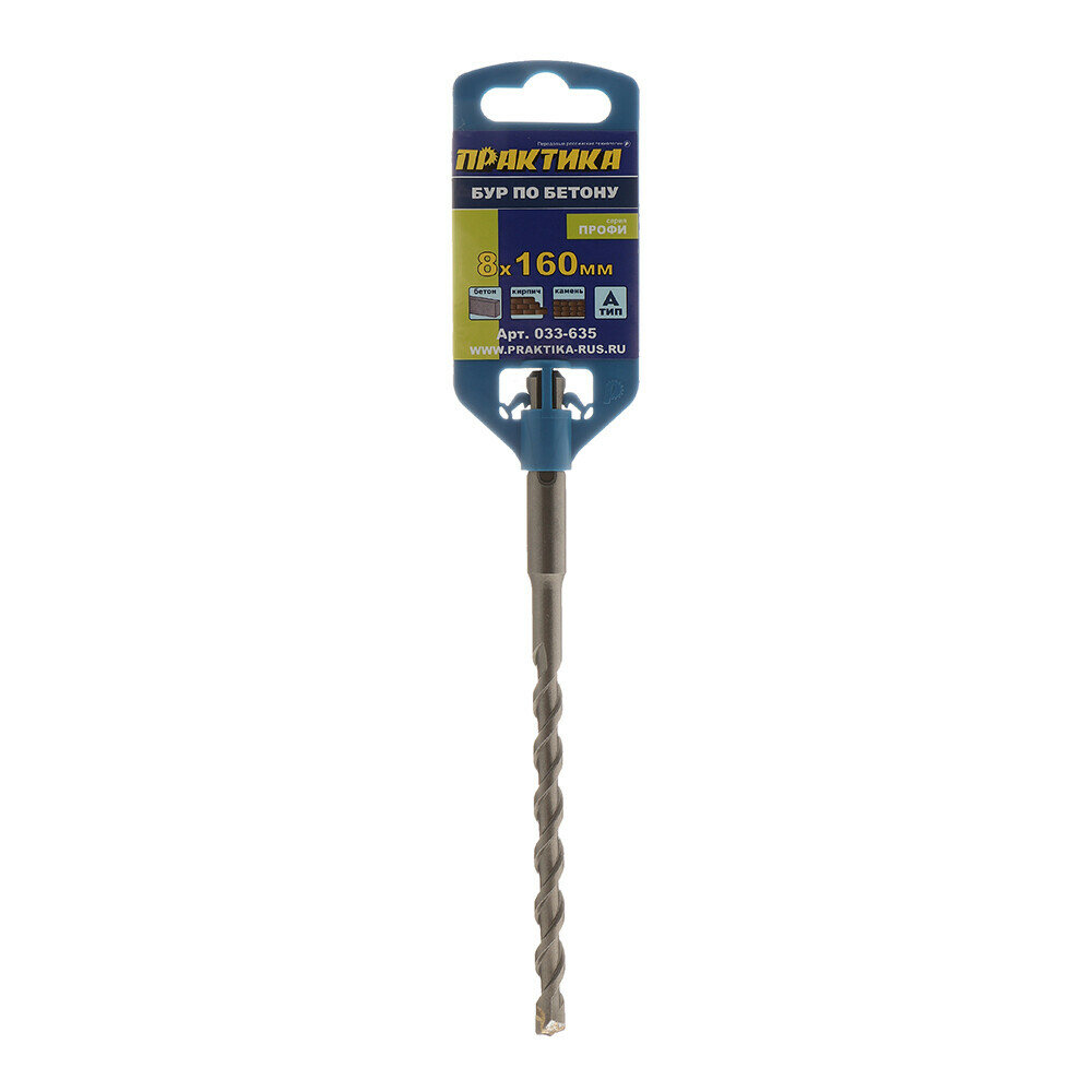 Бур 8х160 мм А-тип Практика предназначен для ударного сверления отверстий в бетоне, кирпиче, камне, 2-3 кг перфораторами системы SDS-plus. Прямая твердосплавная напайка бура с центрирующим острием из карбида вольфрама ВК8 обладает более высоким ресурсом по сравнению с обычными косыми напайками и обеспечивает идеально точное засверливание. Широкая одинарная спираль с наибольшей эффективностью отводит шлам из отверстия. Цилиндрическое тело бура увеличенного сечения обладает большой жесткостью, что способствует снижению бокового износа. Как следствие буры А-тип обладают наивысшей скоростью сверления в своем классе. Диаметр 8 мм, длина общая/рабочая 160/100 мм. Серия «Профи».