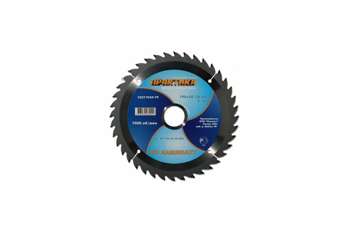 Пильный диск по ламинированным материалам, ДСП, пластику. ГОСТ 9769-79. Серия "Мастер". Высококачественный пильный диск для ручных дисковых пил и станков. Твердость тела HRC 45-46, напаек из карбида вольфрама. Угол атаки зуба + 10°.