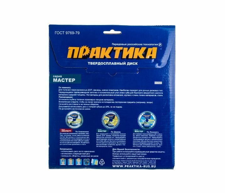 Пильный диск Практика 034-281 по ламинированным материалам, ДСП, пластику. ГОСТ 9769-79. Серия "Мастер". Высококачественный пильный диски для ручных дисковых пил и станков. Твердость тела HRC 45-46, напаек из карбида вольфрама (сплав ВК8) HRC. 90-93. Угол атаки зуба + 10°.