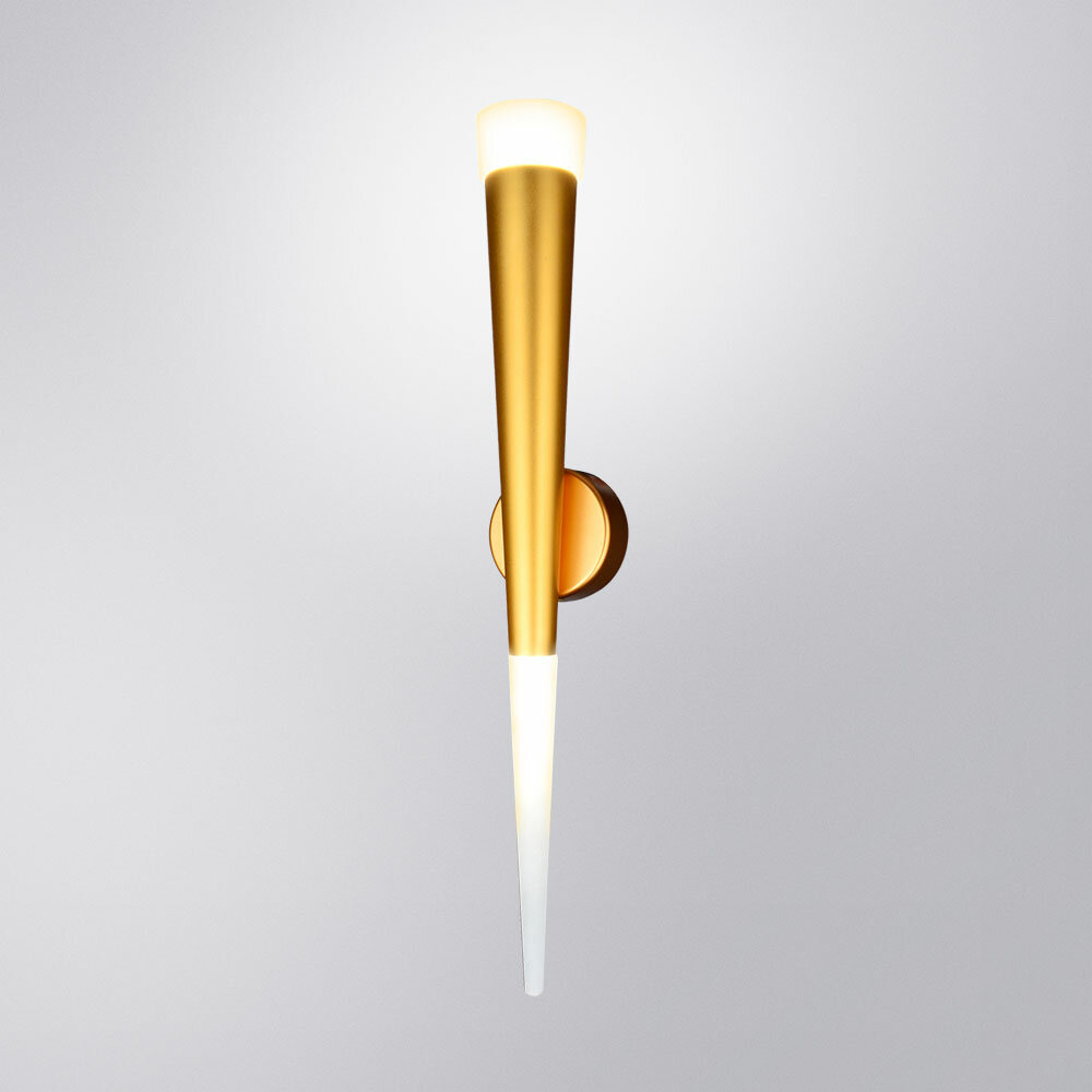 Бра Arte Lamp серии SABIK в стиле хай-тек. Подчеркнет стиль помещения. Размеры 9x6x44 cm. Параметры пылевлагозащиты IP 20. Форма конусная. Плафон пластиковый белого цвета, а материал/цвет арматуры металл/золотистый. Имеются встроенные светодиодные лампы, рассчитанные на весь срок службы светильника. Площадь освещения охватывает 1 m?. Идеально подходит для офиса, для прихожей, для спальни. Страна происхождения бренда ИТАЛИЯ. Мощность светильника 7 Вт. Световой поток 400 Лм. Цветовая температура 4 000К. Срок службы 25000ч.
