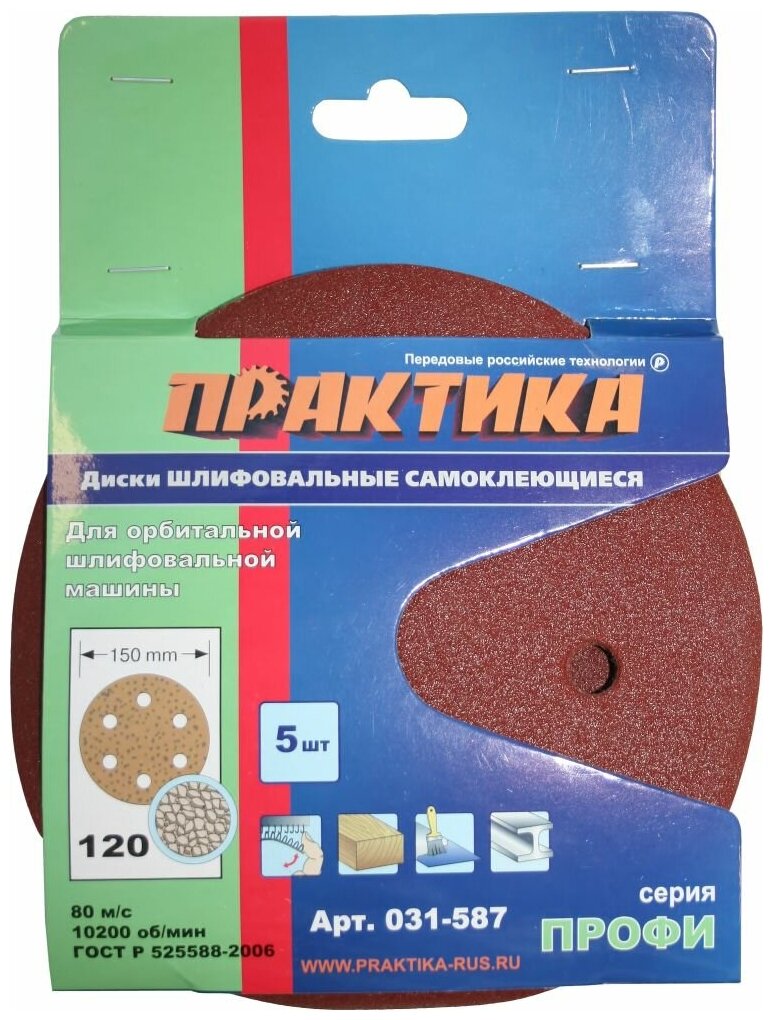 Круги шлифовальные самоклеящиеся с отверстиями для пылеудаления. ГОСТ 8692-88, ГОСТ Р 52588-2006. Серия "Профи". Предназначены для проведения шлифовальных работ с помощью орбитальной шлифовальной машины. Используются для обработки деревянных и металлических плоских поверхностей, снятия с них краски, лака, ржавчины, заусенцев. Изготовлены из высококачественного абразивного материала. В полуоткрытой картонной упаковке с евроотверстием по 5 штук.