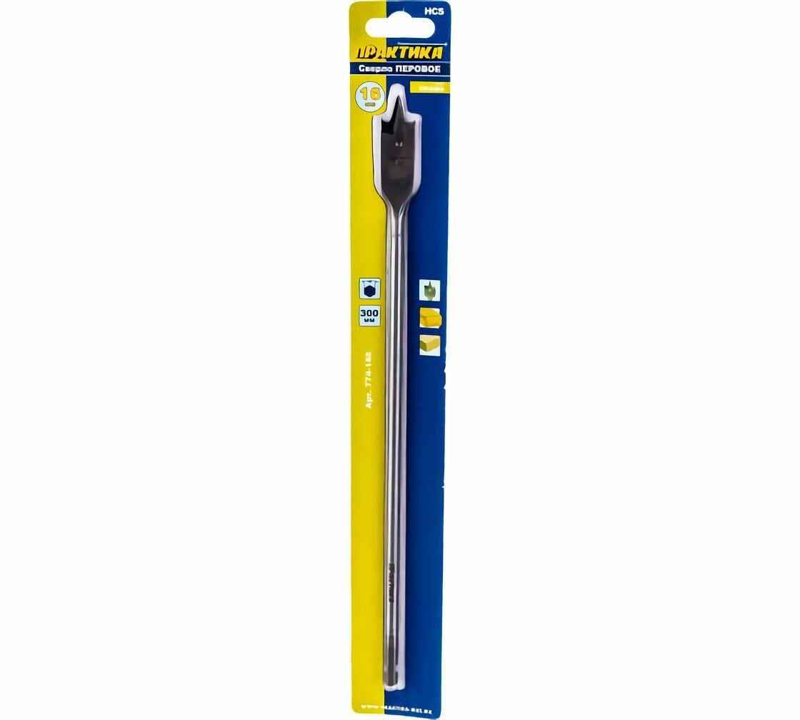 Сверло по дереву перовое ПРАКТИКА 16 х 300 мм (1шт.) блистер-перовые сверла по дереву из высококачественной углеродистой стали, с шестигранным хвостовиком 1/4”. Сверло с боковой подточкой для аккуратных и неглубоких отверстий в древесине мягкой и средней твердости. При работе рекомендуется высокая скорость сверления.