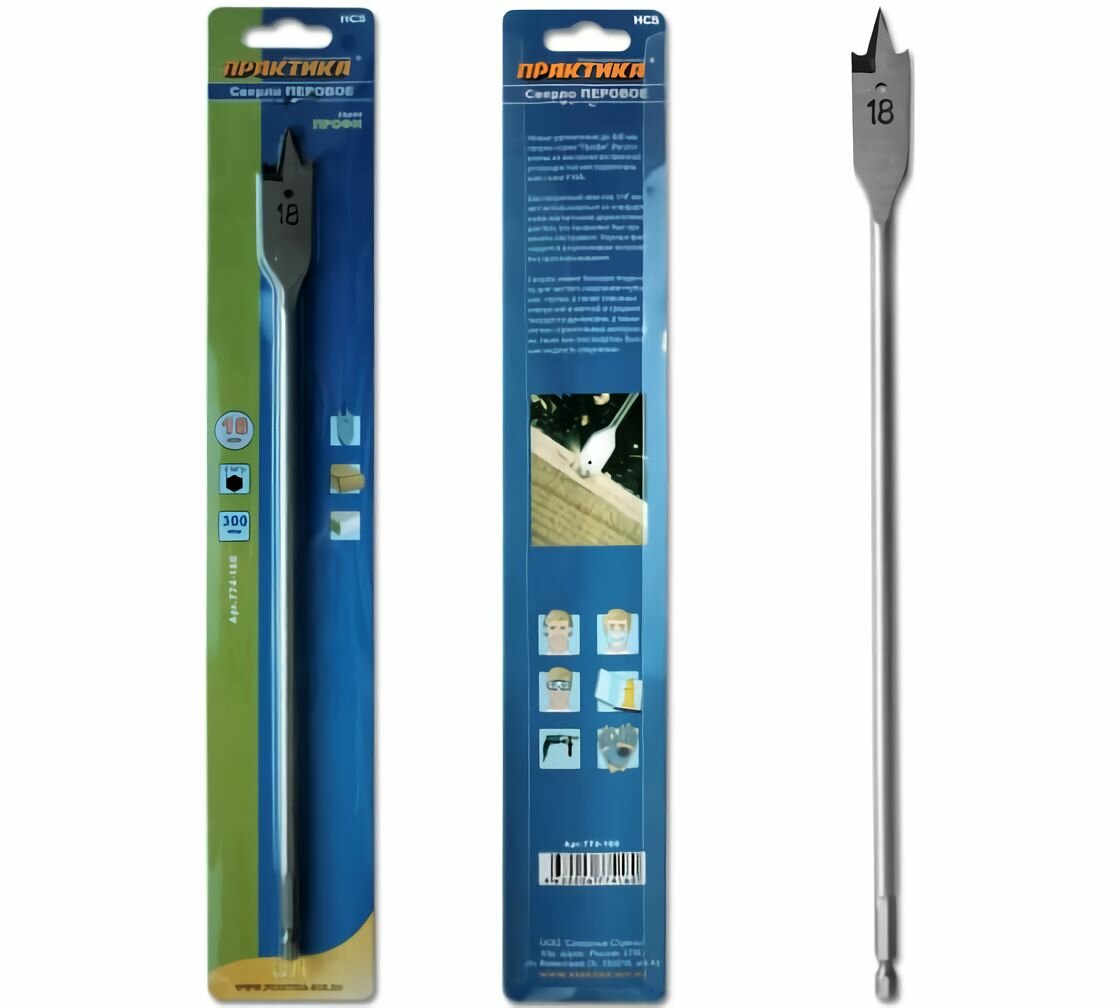 Сверло по дереву перовое ПРАКТИКА 18 х 300 мм (1шт.) блистер-перовые сверла по дереву из высококачественной углеродистой стали, с шестигранным хвостовиком 1/4”. Сверло с боковой подточкой для аккуратных и неглубоких отверстий в древесине мягкой и средней твердости. При работе рекомендуется высокая скорость сверления.