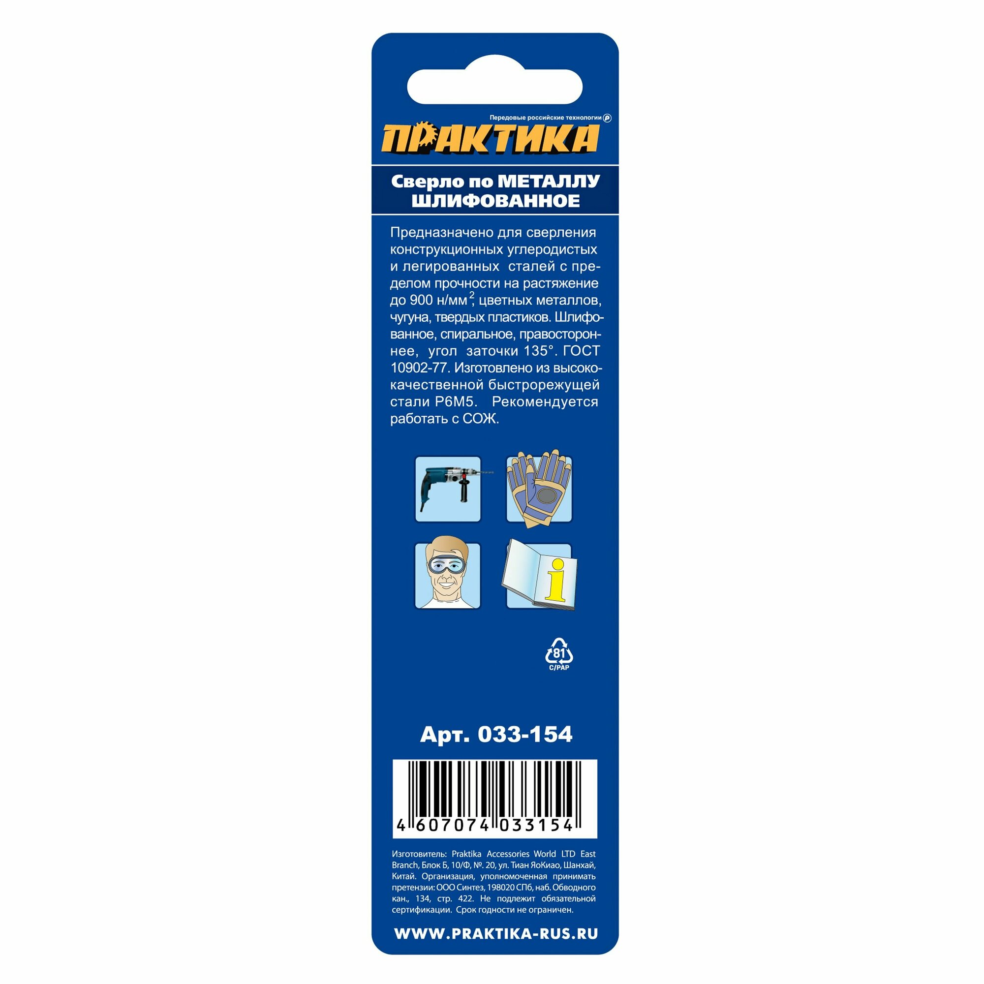 Серия "Профи". ГОСТ 10902-77 (DIN338). Для быстрой производительной работы по большинству строительных сталей. Полностью шлифованное. Угол заточки острия 118°. Подходит для обработки металлов с пределом прочности на растяжение до 900 Н/кв.мм. Рекомендуется применять охлаждение эмульсией. В индивидуальной блистерной упаковке.