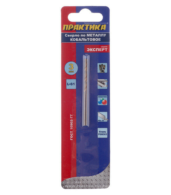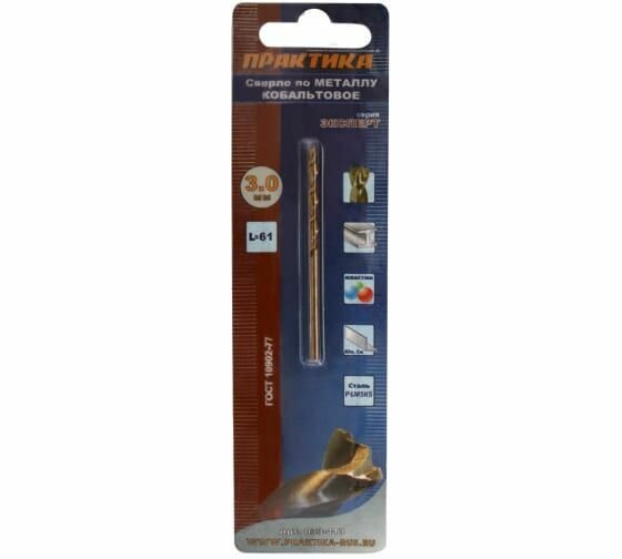 | Прочие особенности и свойства | Сверло по металлу кобальтовое ПРАКТИКА 3,0 х 61 мм Р6М5К5, (1шт.) блистер |
